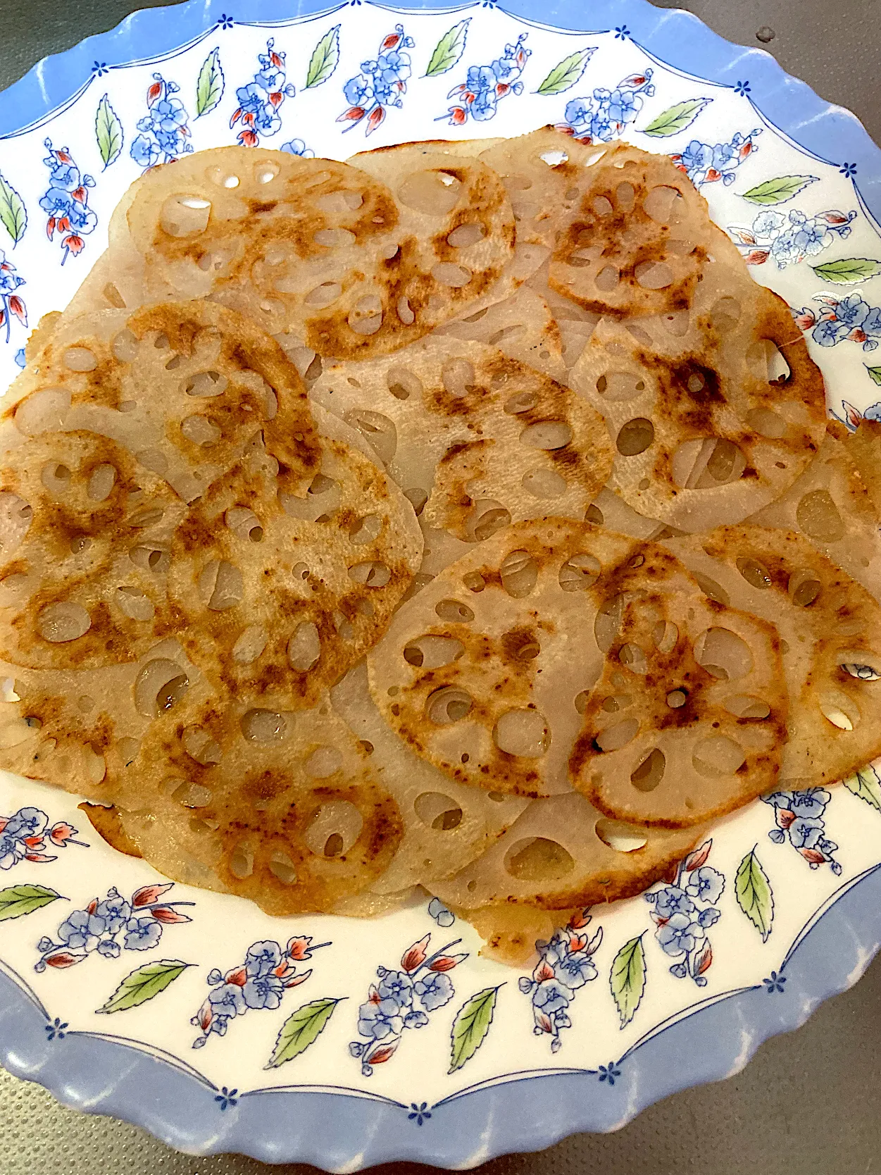 すりおろしたレンコンを入れて7ミリ厚さの円形に広げる。その上に輪切りにしたレンコンを、並べ弱火で、10分間ほど焼く。