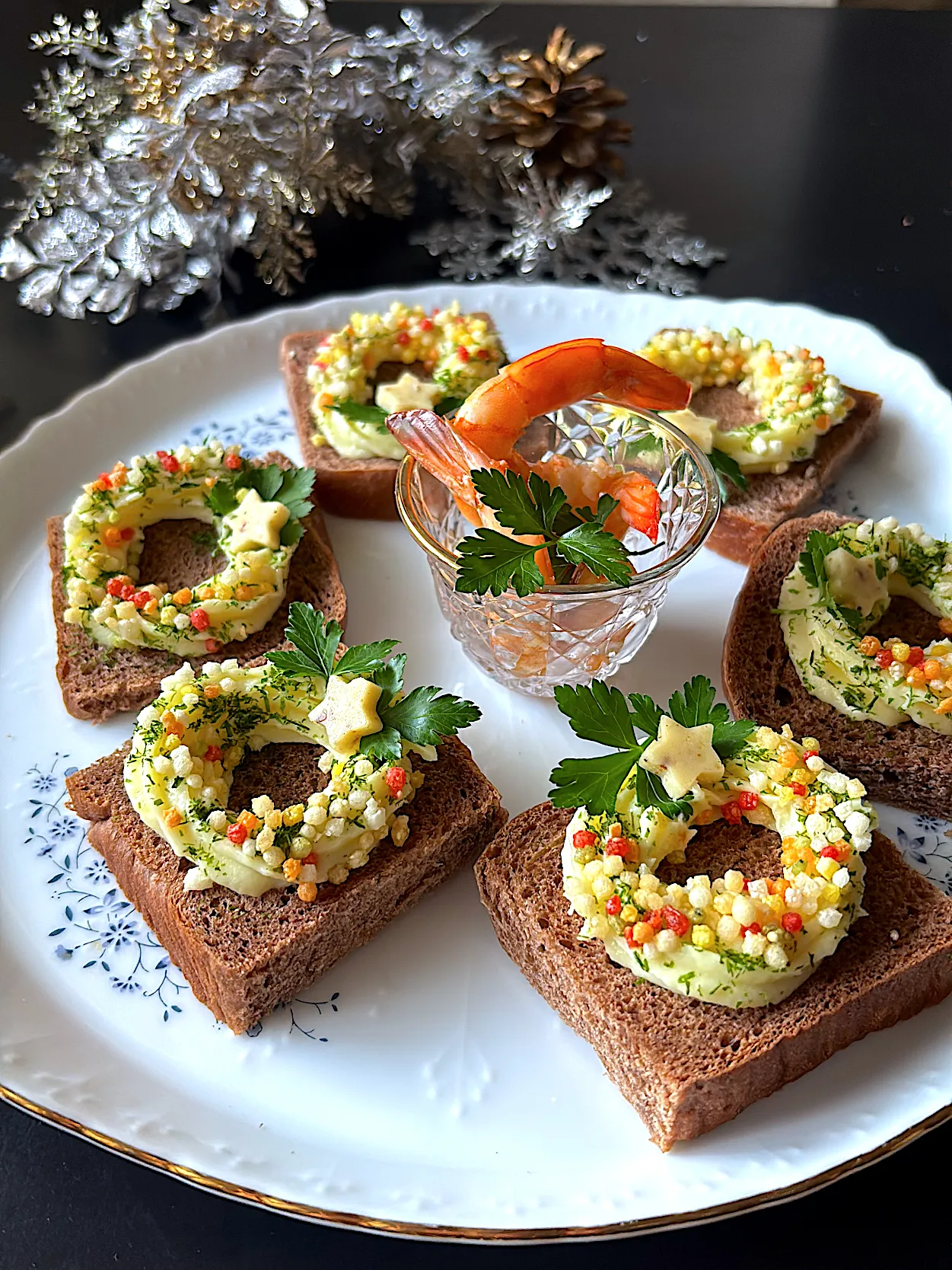 ココア風味のミニ食パンにポテトサラダのリースがすごくオシャレですね゚+.゚(´▽`人)゚+.゚✨