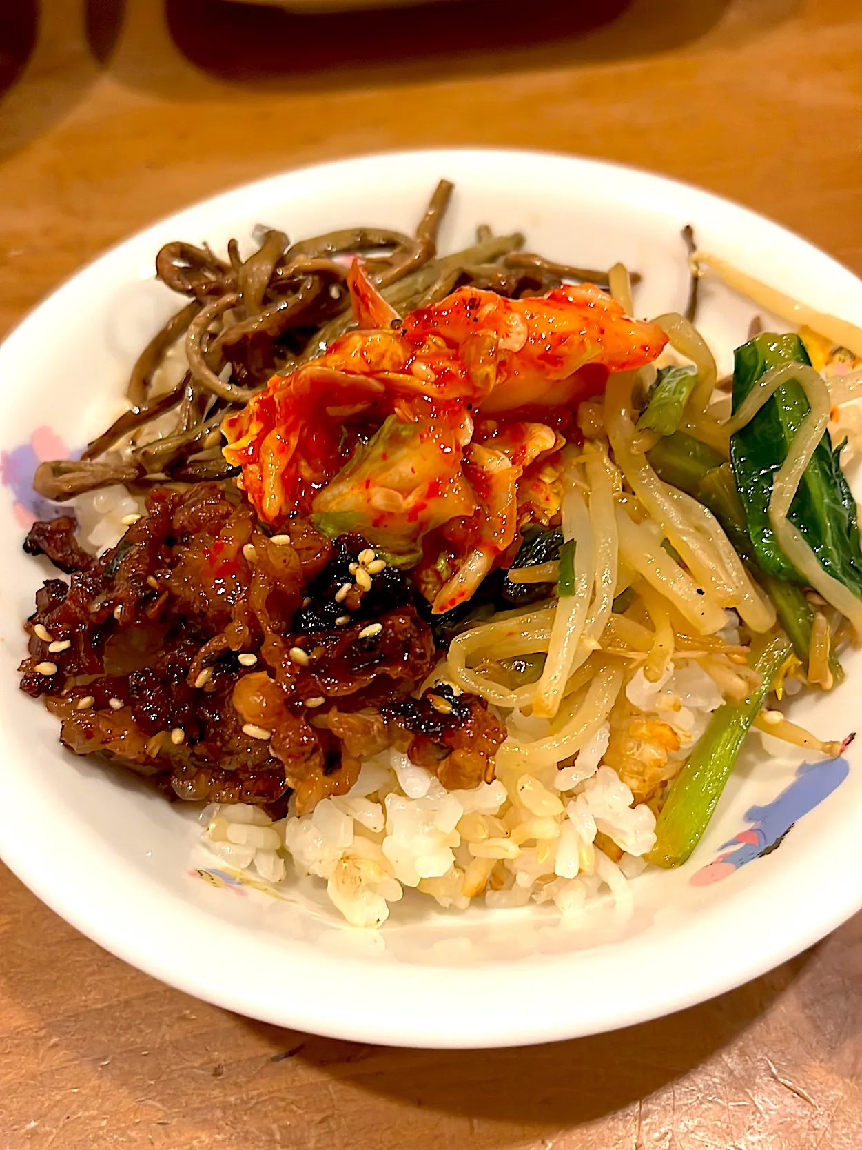 ゼンマイ、小松菜、もやし、牛肉をそれぞれ味付け、キムチをトッピングしました #簡単料理 #ビビンバ