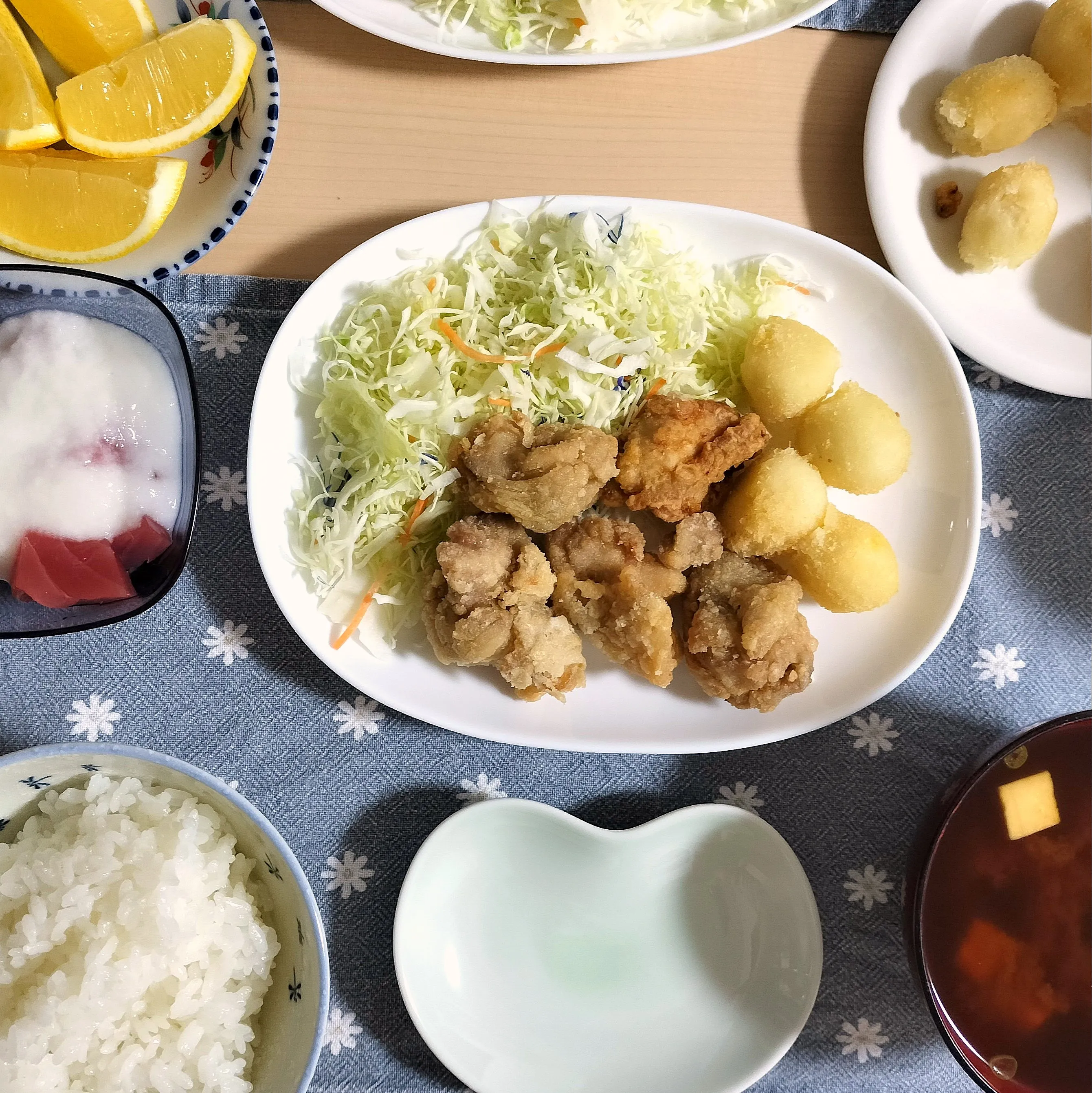 🌛*゜唐揚げ / うずら卵フライ / マグロ山かけ / 味噌汁