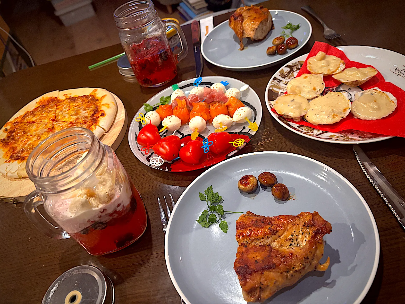 ローストチキン マッシュルームソテー ホタテクリームグラタン ピザ スモークサーモン&生ハム&モッツァレラチーズ トマト ベリースパークリング&アイスクリーム