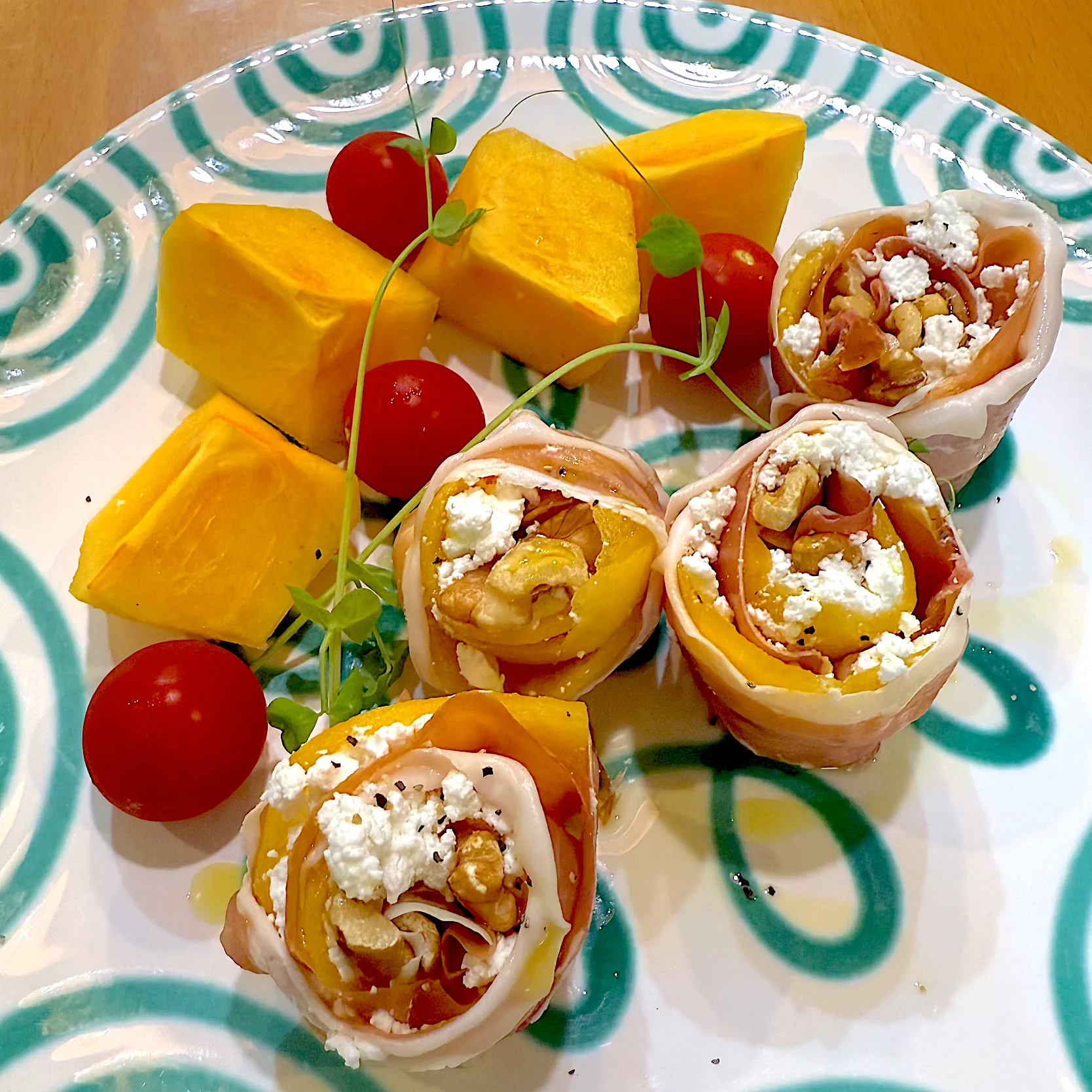 🌿生ハムで、桂剥きの要領で薄切りした柿、カッテージチーズ、胡桃をくるくる巻いて、オリーブオイルと黒胡椒をパラパラ…💛 生ハム然り、年末年始や誕生日のイベント用にDining Plusさんの美味しい輸入食材をチェックし始めると止まらなくなる…