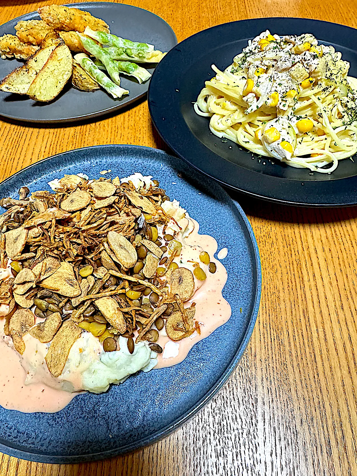 豆乳クリームパスタ 明太ポテサラ ささみスティック、枝豆カリカリ揚げ、 北海道から送られてきた伯爵(男爵ではない)🥔を使ってフライドポテト
