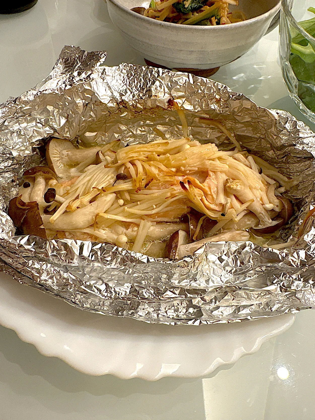 【朝ご飯】 鮭とキノコのホイル焼き(バター醤油味)