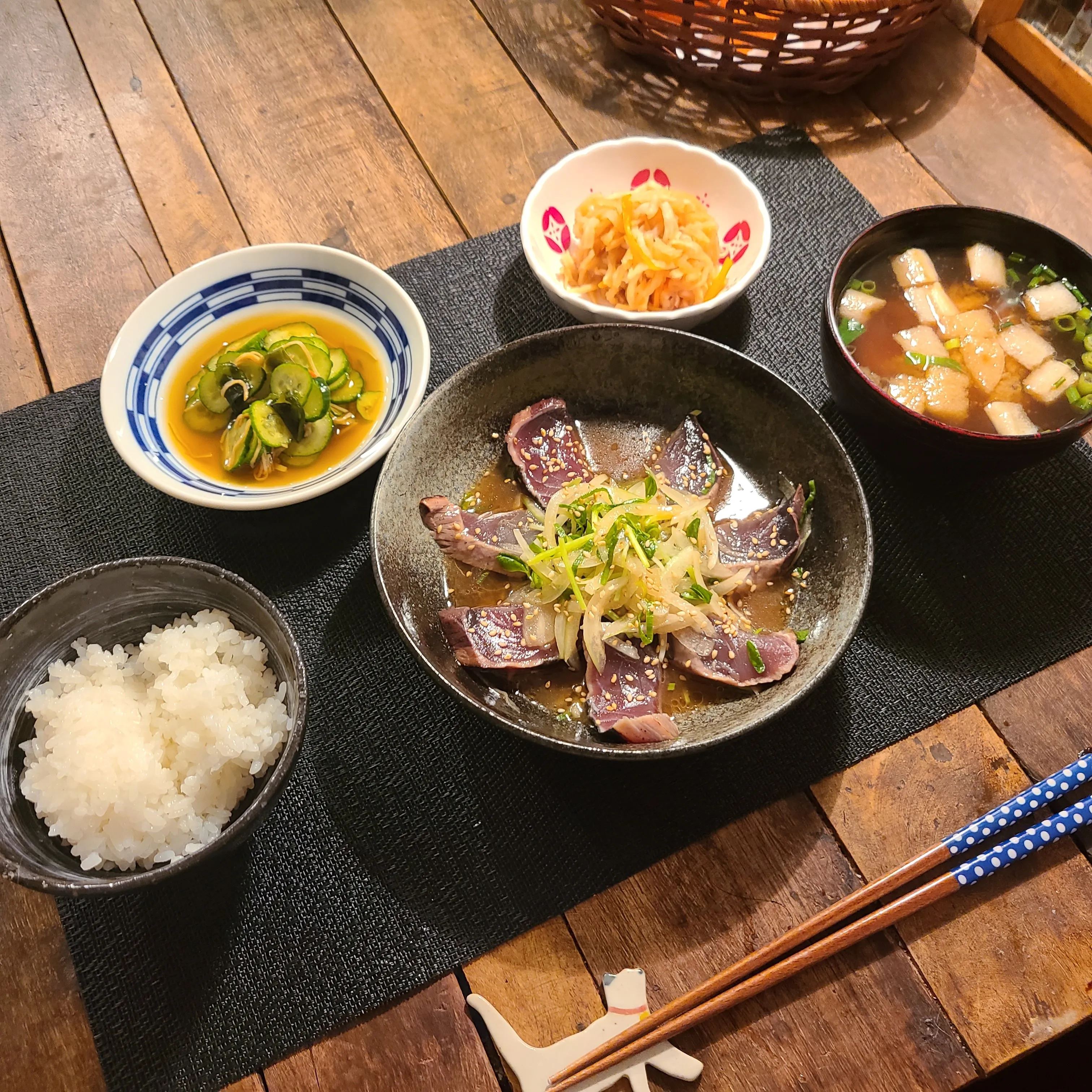 あとはきゅうりとカニかまの酢の物、切干大根の煮物、ごはん、味噌汁です。