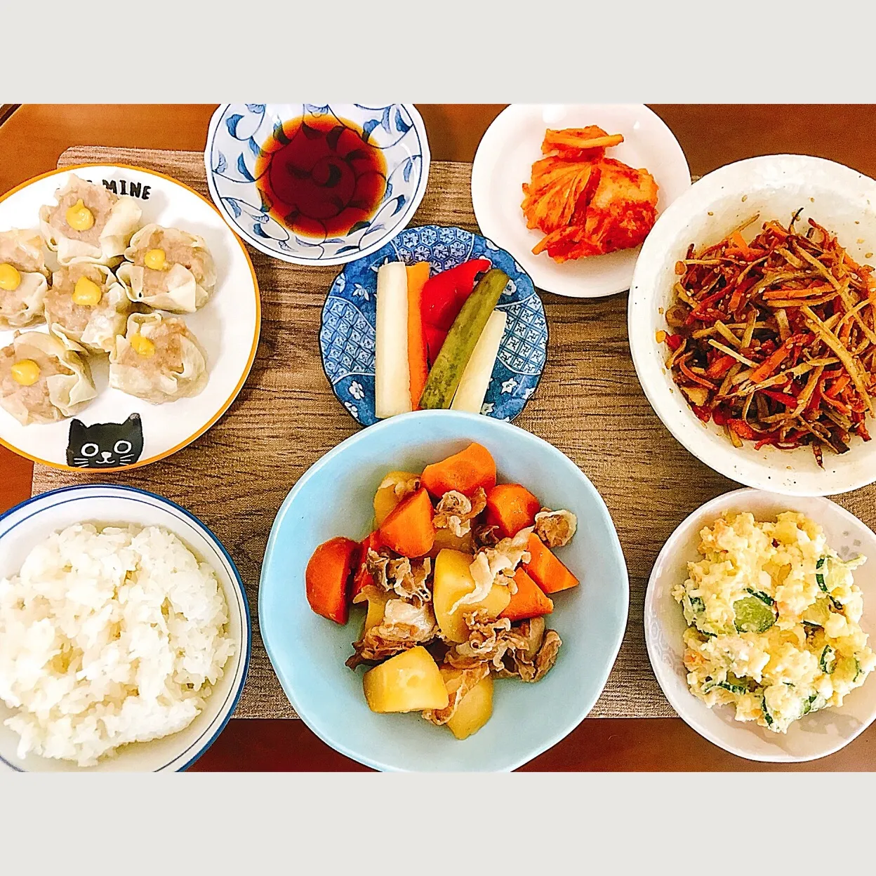 【晩御飯】 肉じゃが しゅうまい ポテサラ きんぴらごぼう ピクルス 白菜キムチ 白米