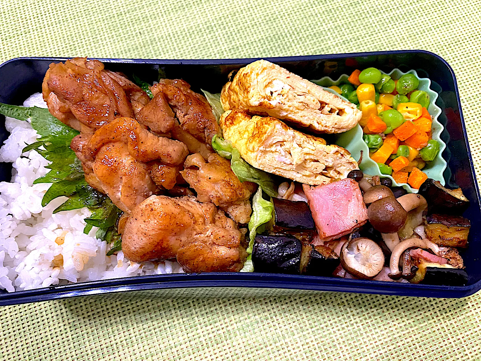 #簡単料理 #単身赴任 #お弁当 #鶏もも肉の五香粉風味照り焼き #卵焼き #茄子とベーコンの塩胡椒焼き #ミックスベジタブル
