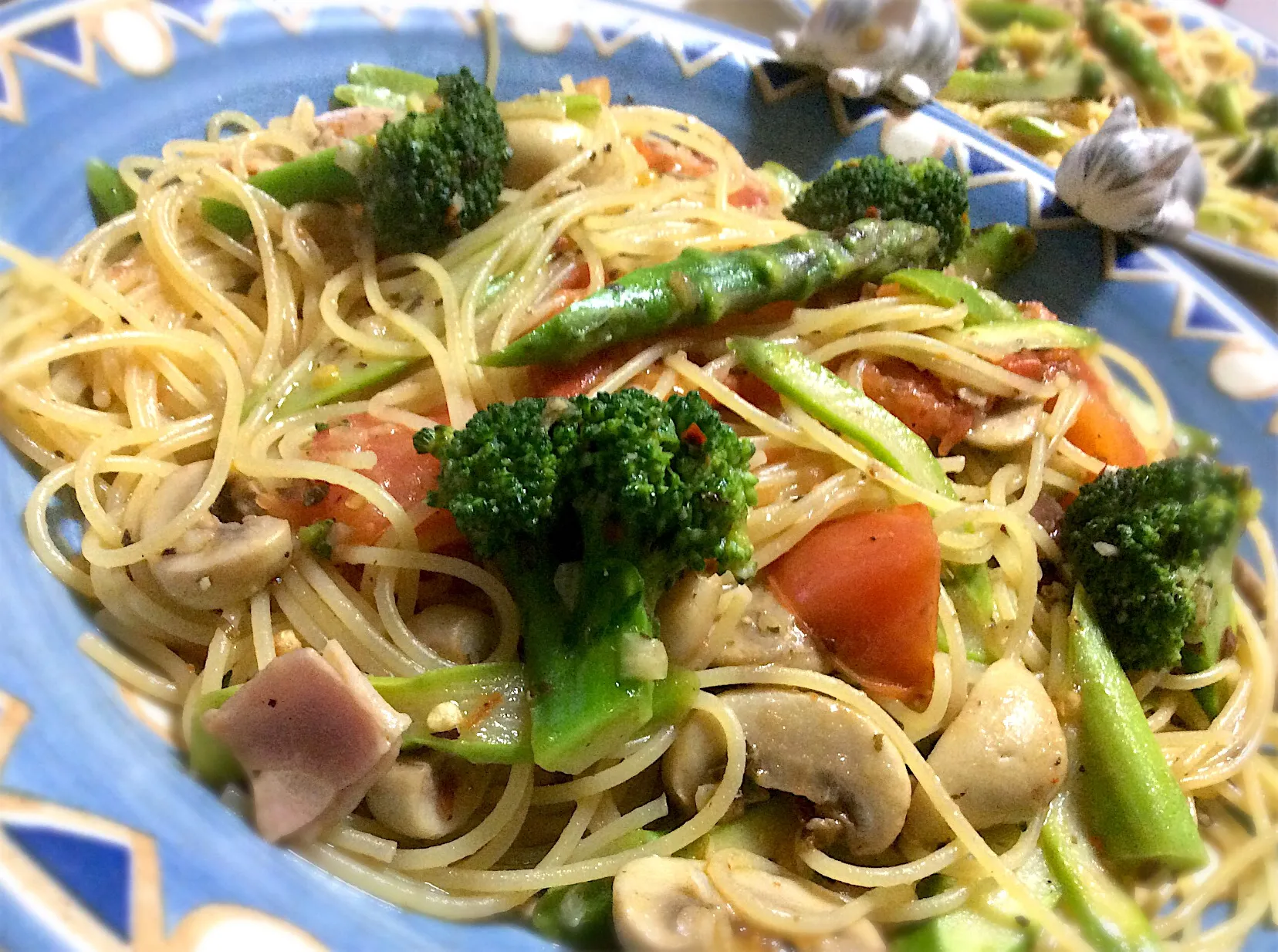トマト、ブロッコリー、アスパラ、ベーコン、マッシュで ペペロン風にガーリック味で