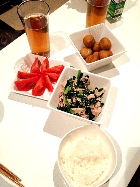 豚ニラの味噌炒め、里芋の煮物、トマト、ごはん