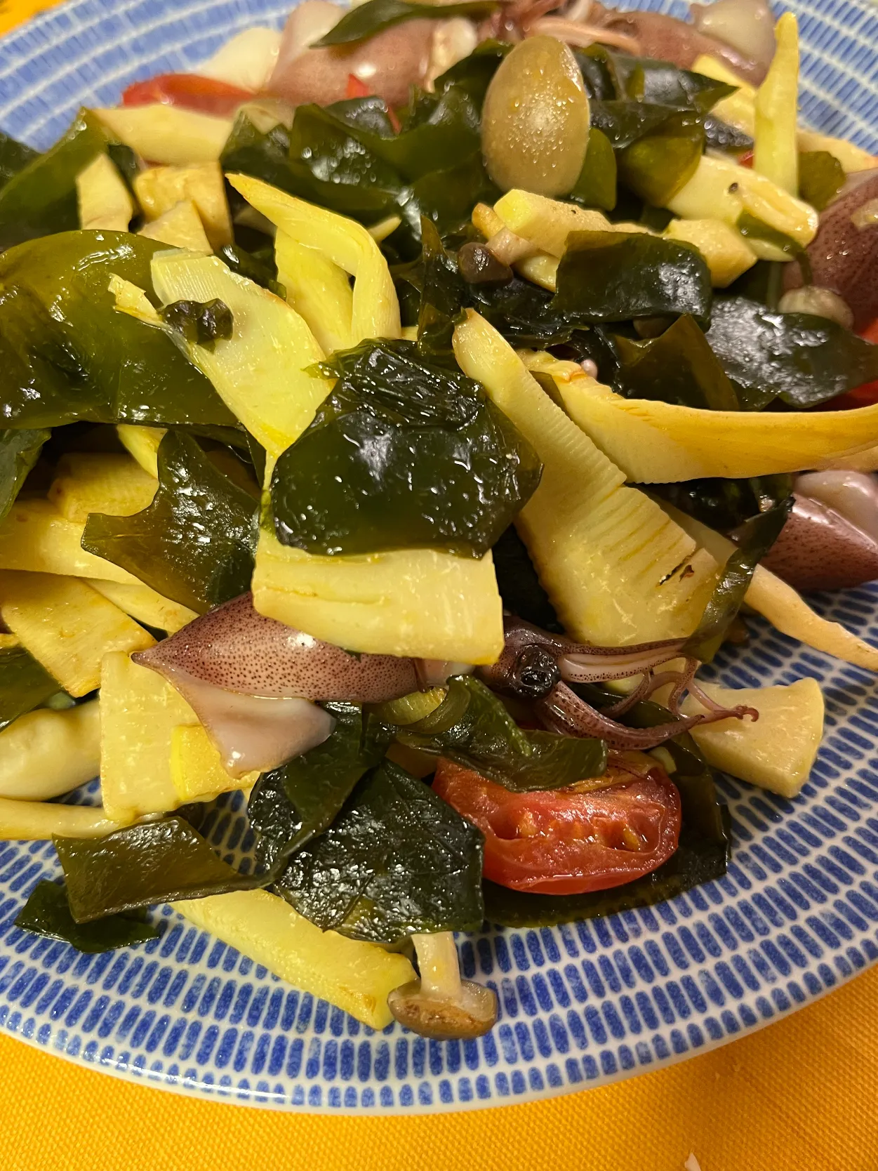 夕飯のサラダにとタケノコを焼いてみた。ついでにワカメも炒めたらなかなか😋 #サラダ