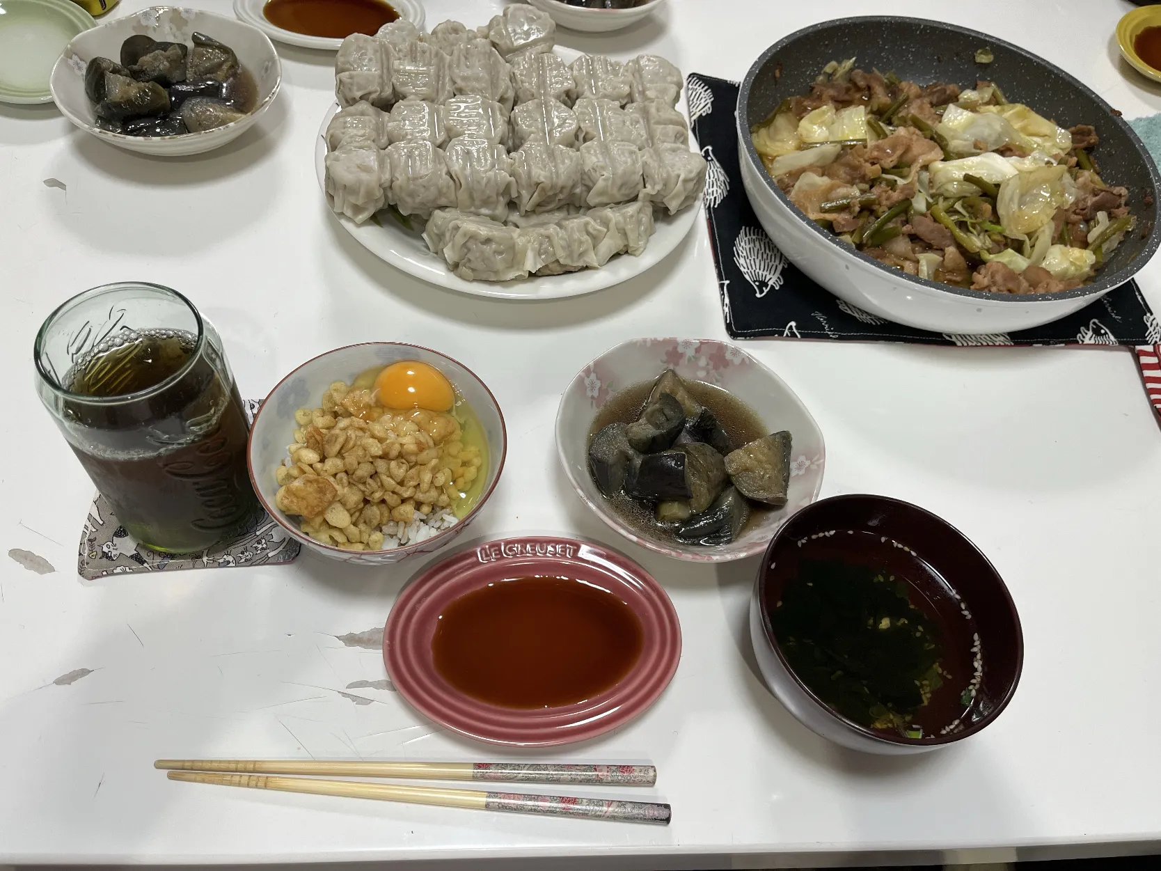 晩御飯☆天かす入り卵かけご飯☆焼売☆揚げなすの煮浸し☆味付け豚タンの炒め物