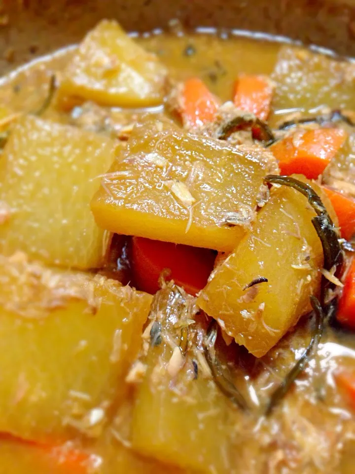 大根と人参を鯖の味噌煮缶と刻み昆布で煮付けてみましたヾ(@⌒ー⌒@)ノ