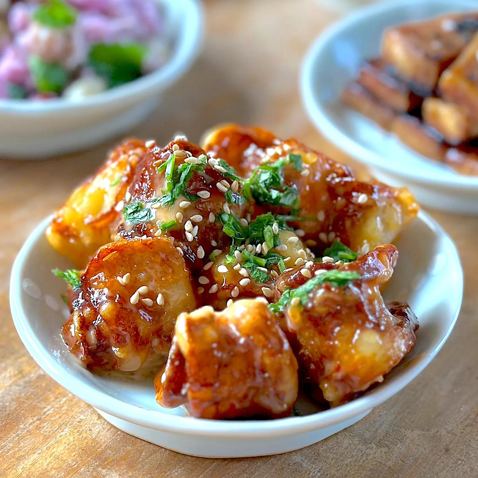 縦半分に切った竹輪を中が外に来るようにクルクル丸めたら楊枝を突き刺し止める。水溶き片栗粉に潜らせ揚げたら、スイートチリソースとマヨネーズを同量で混ぜたものを絡める。胡麻とパクチーかけました。