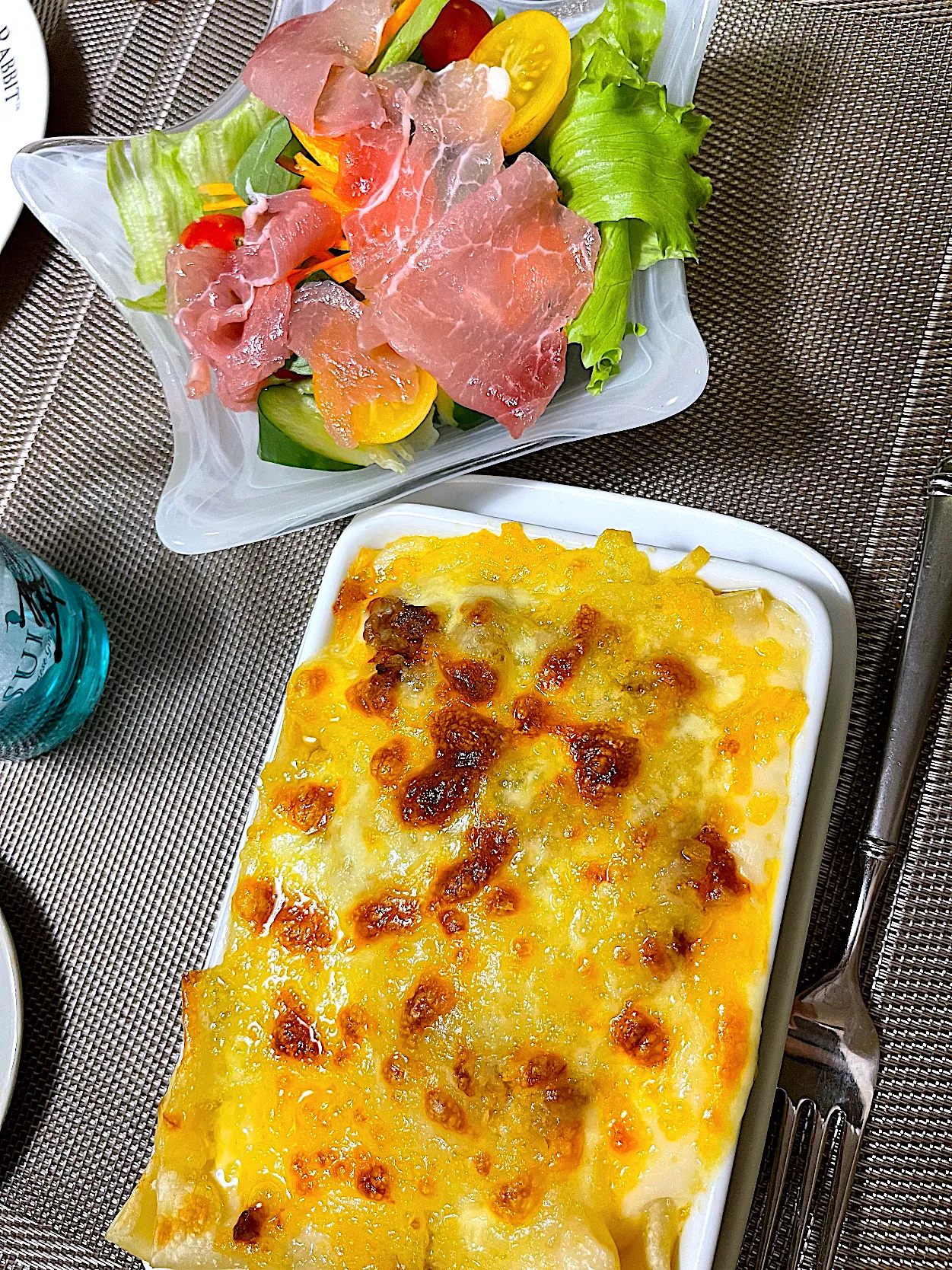 大学の夏休みで帰省している息子のリクエスト。自炊で頑張っている息子もミートソースとホワイトソース、ラザニアシートを重ねてチーズをまぶして焼く手間は難しいと。張り切って作った😊 #ラザニア