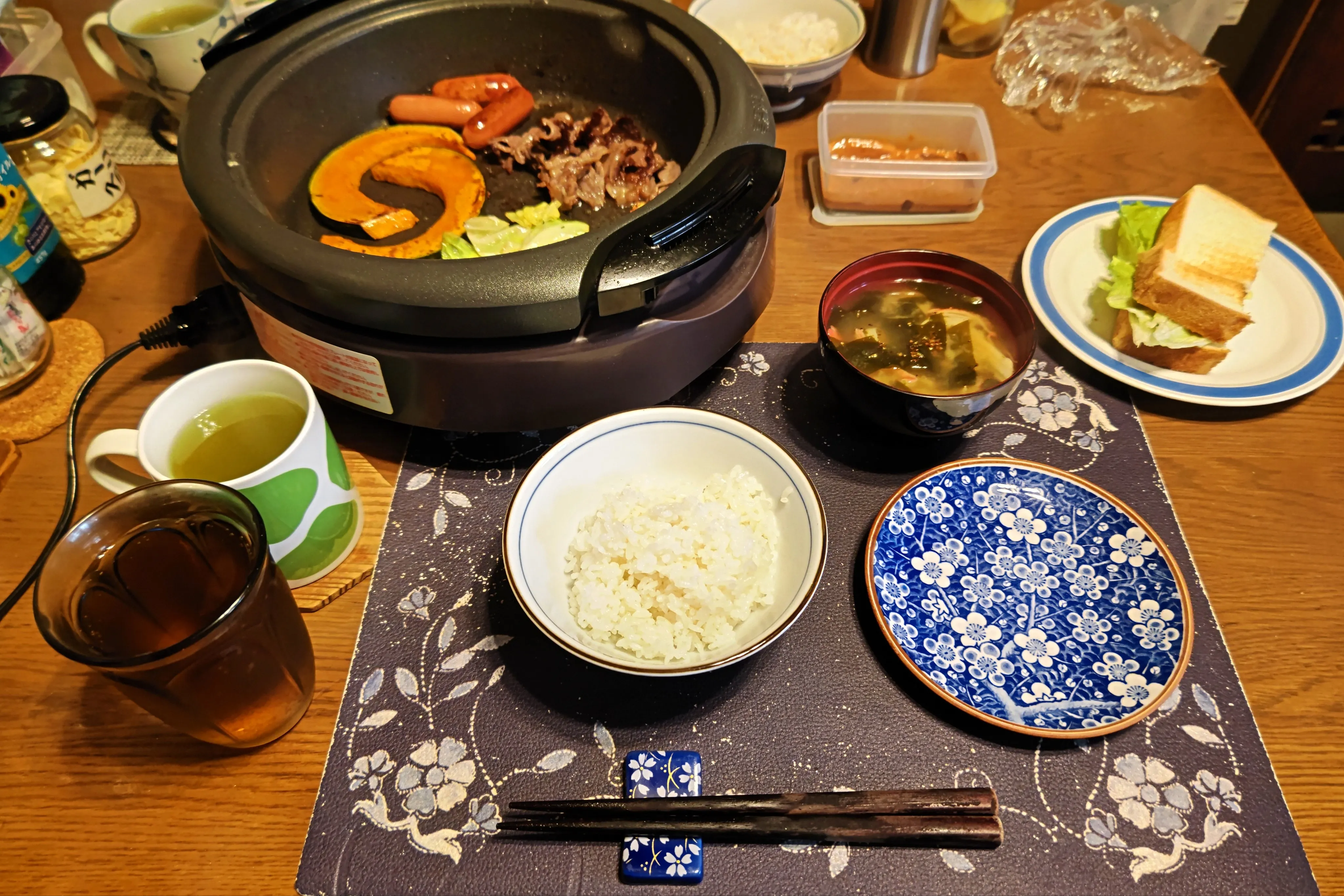 ・鉄板焼き:国産黒毛和牛切り落とし,ウインナー,クレイジーソルトで下味をつけたキャベツ,薄切りかぼちゃ。焼肉のたれ