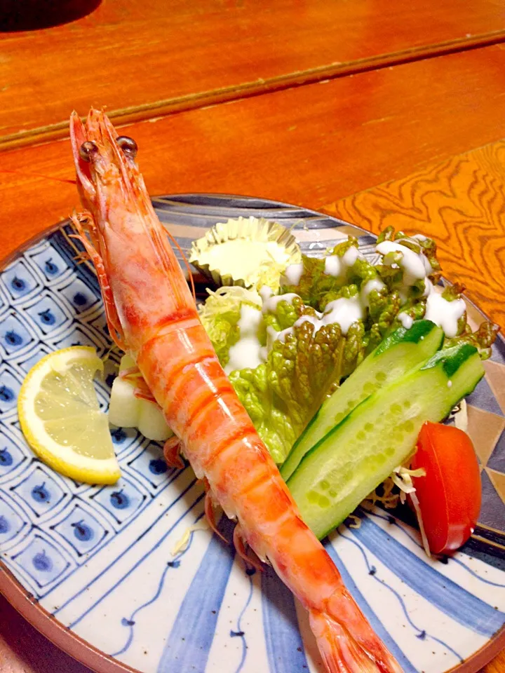 大きな車海老のサラダ、民宿の晩御飯@二見浦