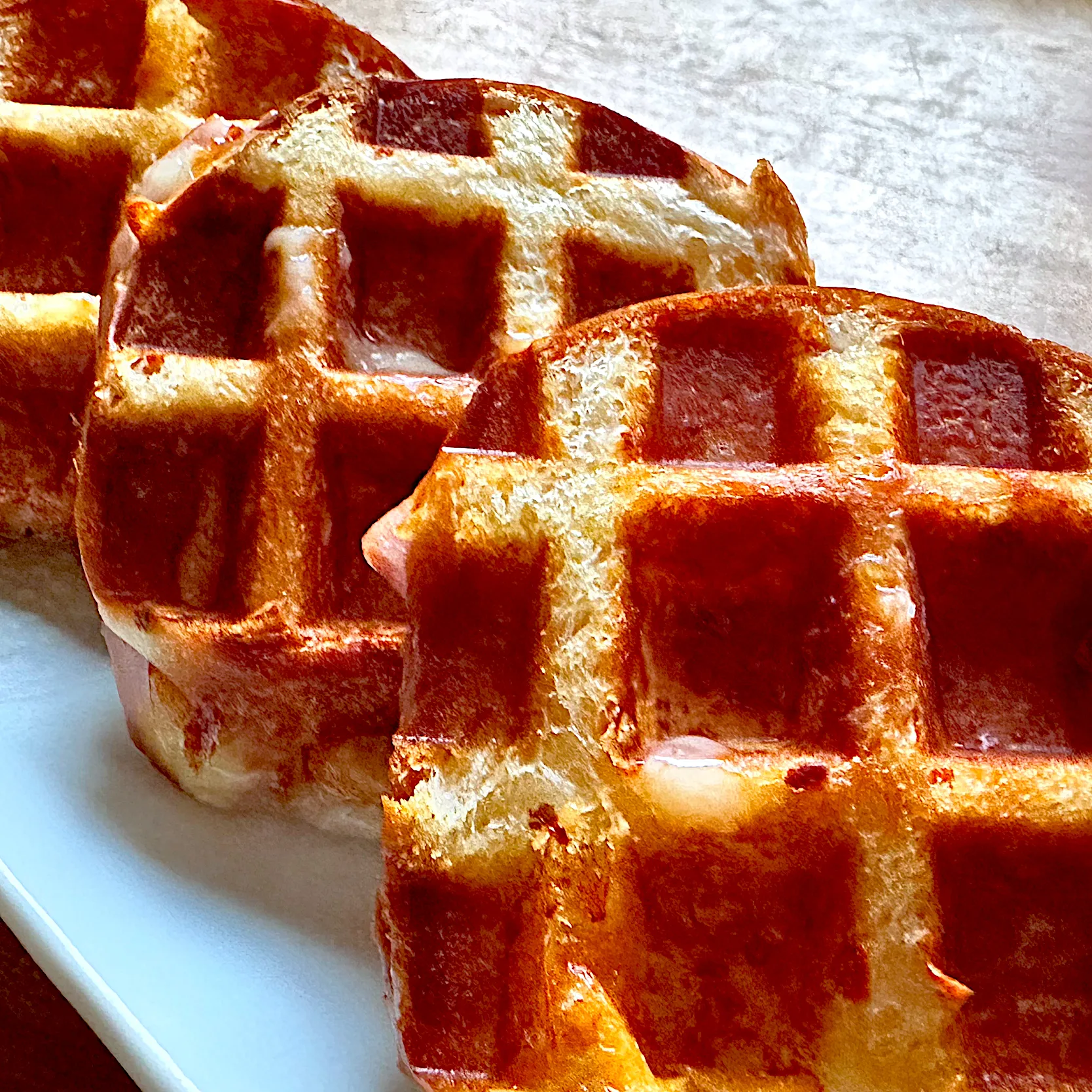 自家製のミニ食パンにいろんな具を挟んでワッフルメーカーで焼いたやつ。これはハムとチーズやけど、これじゃあわからんね。まあ、シナモンバターシュガーとか、柿とクリームチーズとか、チョコとか、いろんなもん挟みまくり。おやつとして。あーまた、太る〜。