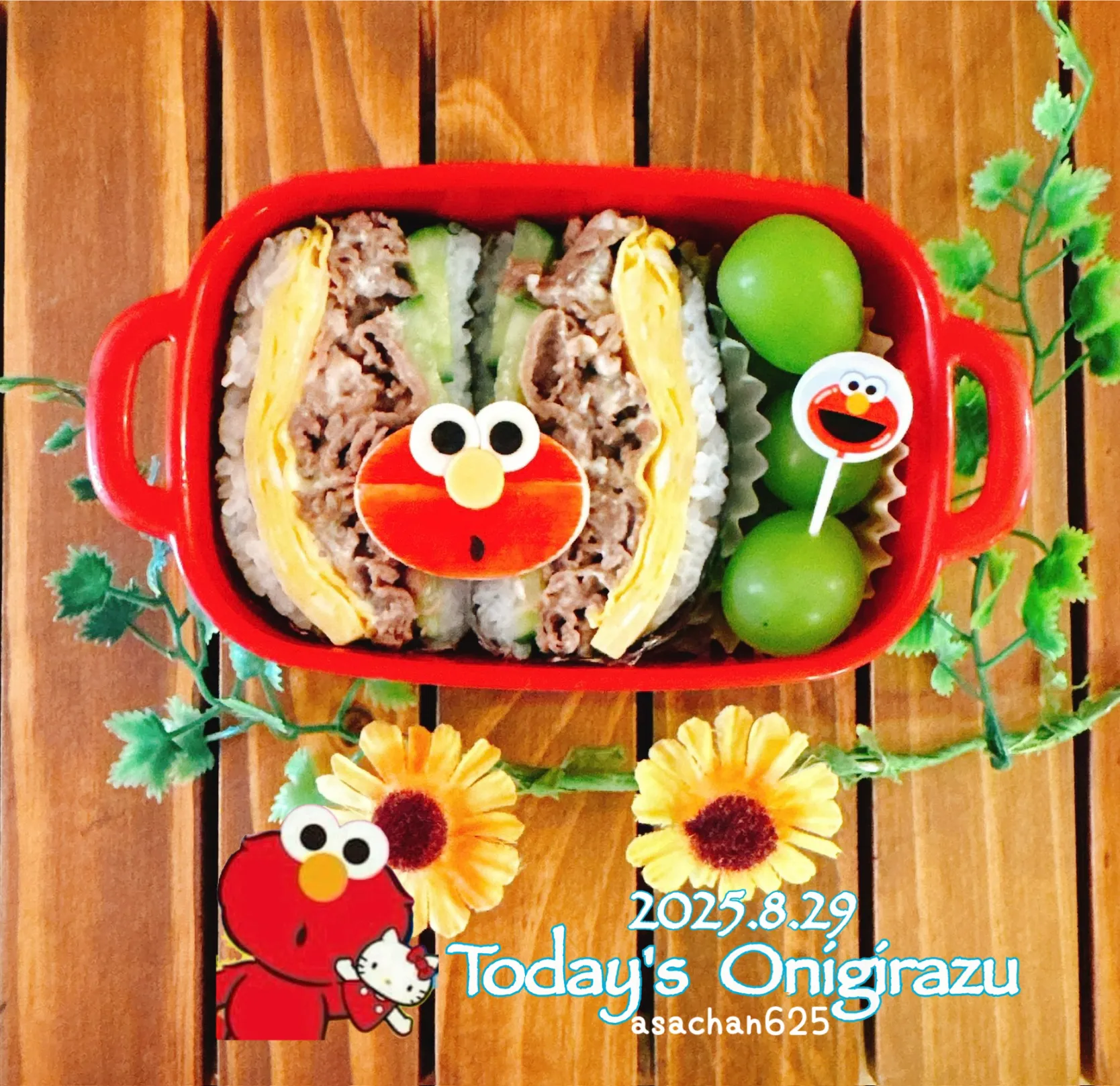 エルモが乗った、牛肉とだし巻き玉子と浅漬けきゅうり入り☝️✨️