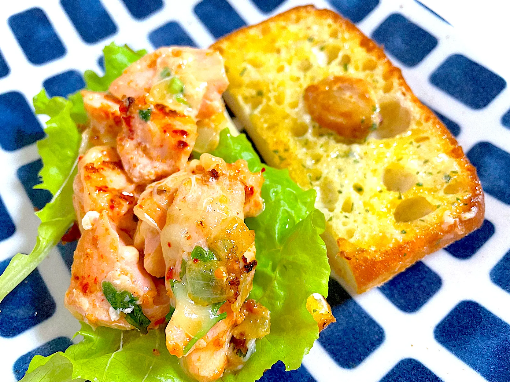 同じフライパンで、コストコガーリックパンを焼き、パンにレタス、サーモンを挟みサンドイッチにしました。