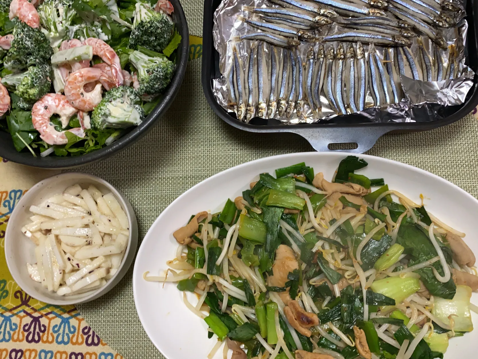 豚ホルモン野菜炒め、きびなご焼き、ブロッコリーとえびのサラダ、長芋梅昆布茶漬け