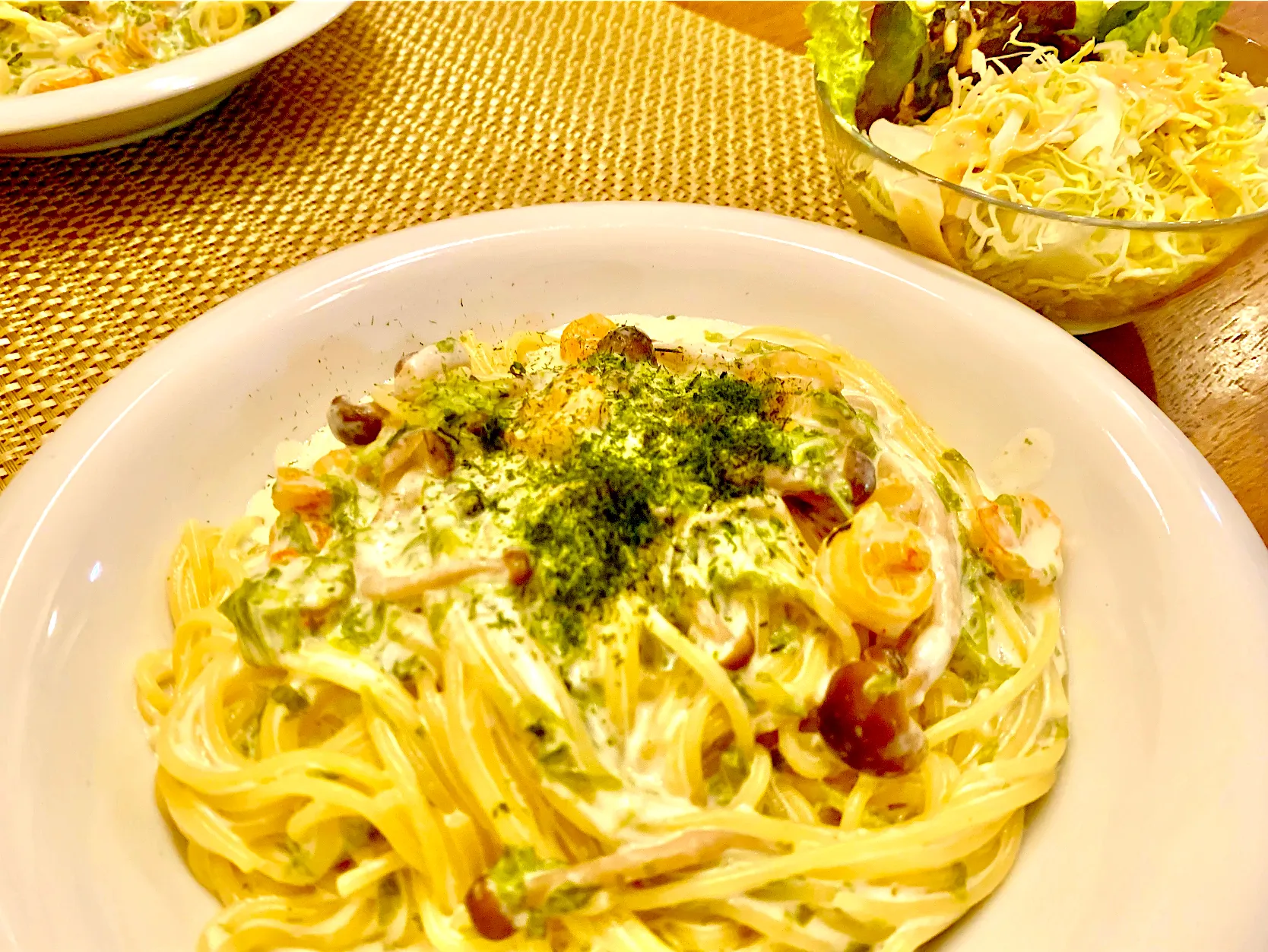 #海苔クリームパスタ #あおさ #海老 #しめじ #ランチ #牛乳 #生クリーム #記録用