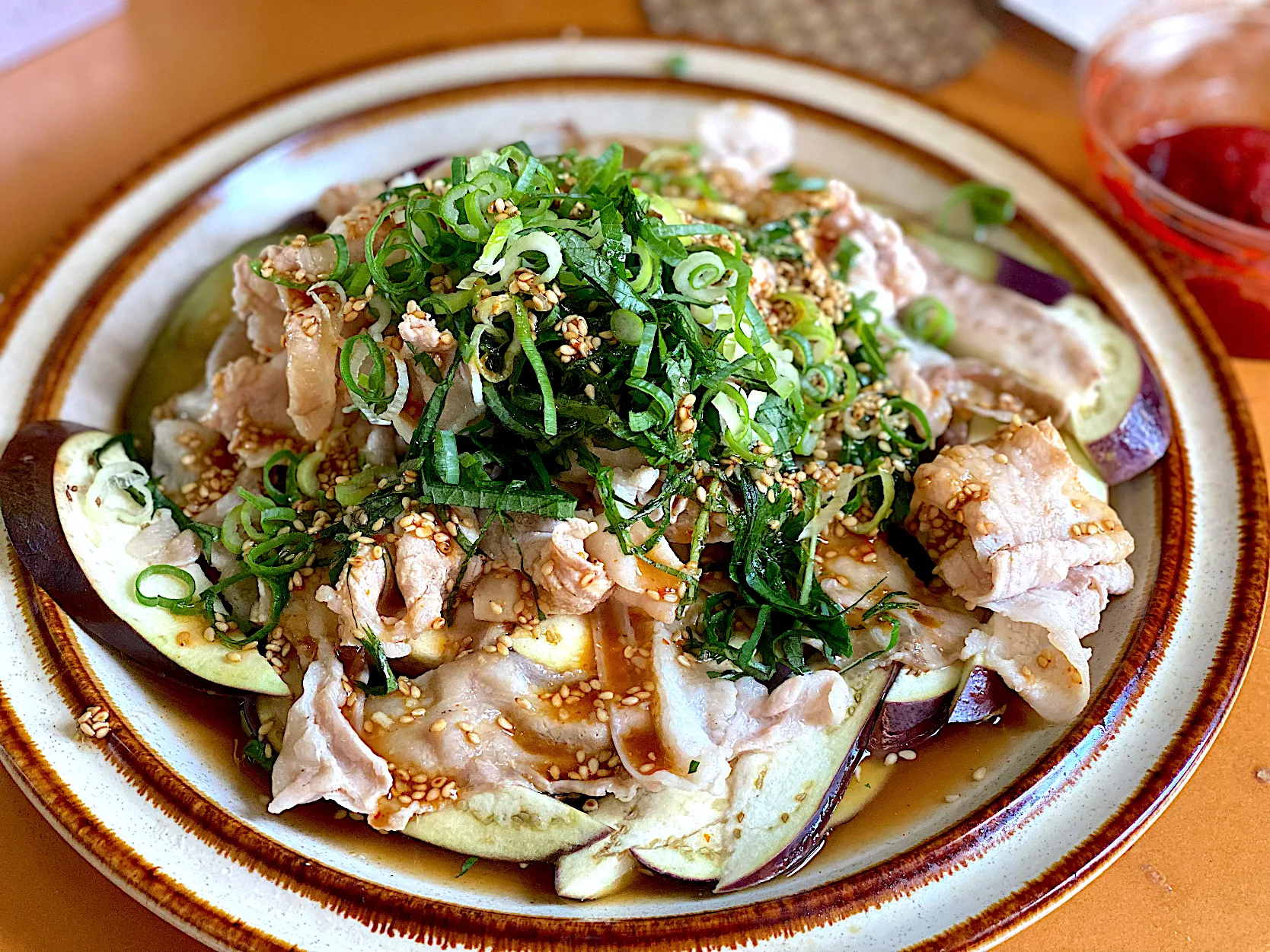 茄子はレンチン、豚は弱火でゆっくり加熱しゃぶしゃぶ。乗っけて甘辛ポン酢だれと薬味をどんと。🍻