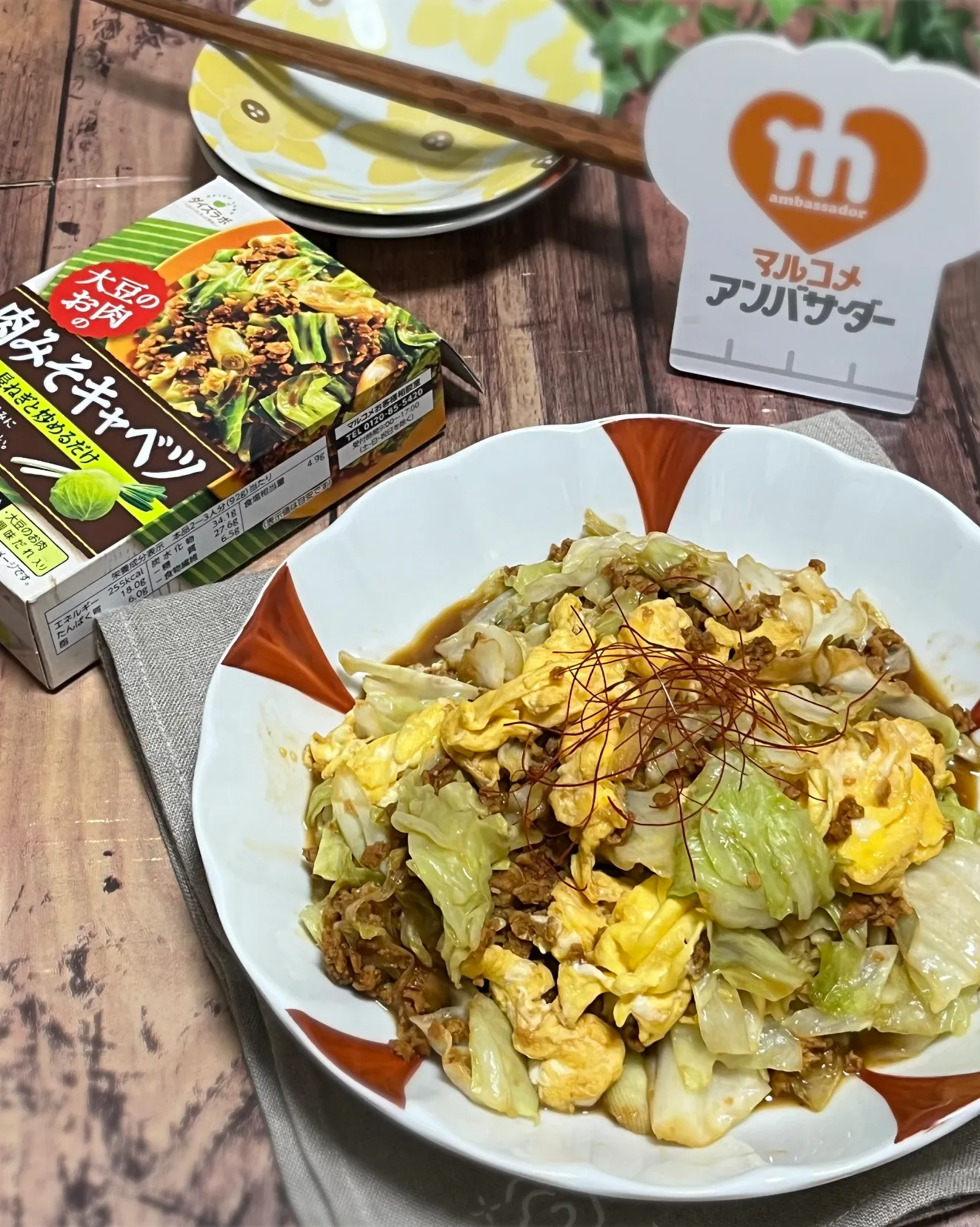 大豆のお肉と調味だれがセットになっているのでキャベツと長ねぎを用意すれば簡単にメインおかずが作れてしまうスグレモノ✨️