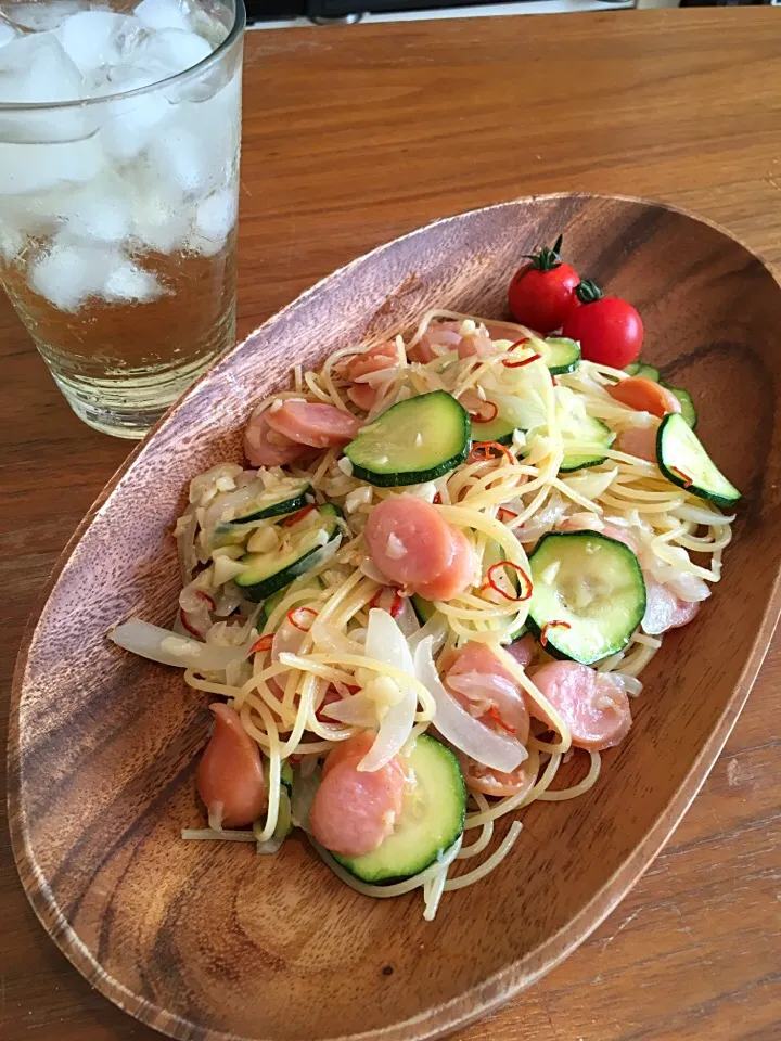 ズッキーニと粗挽きソーセージのペペロンチーノ