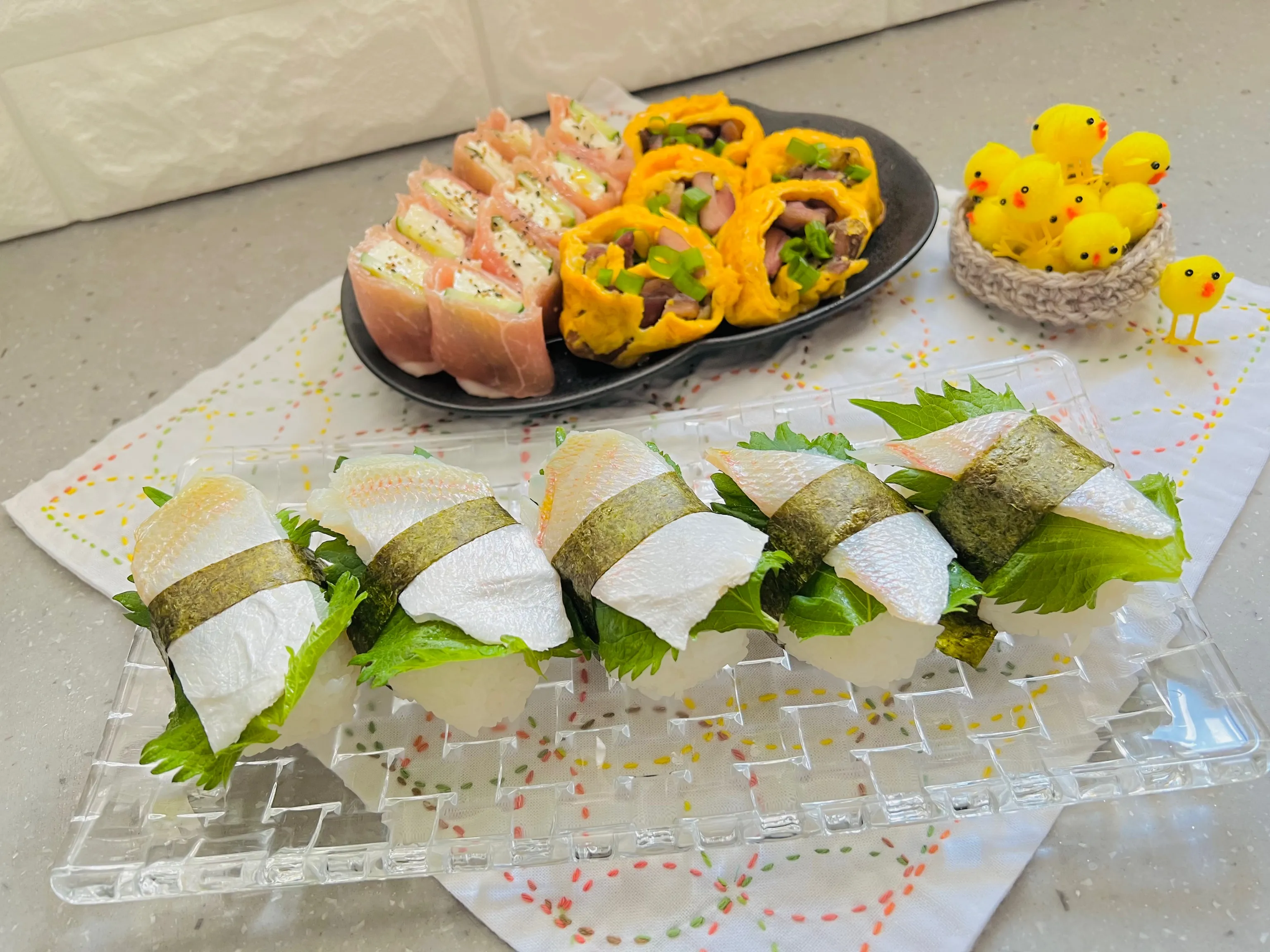きゅうりとカマンベールの生ハム巻きも美味しそうやし、地鶏の卵巻き😳?