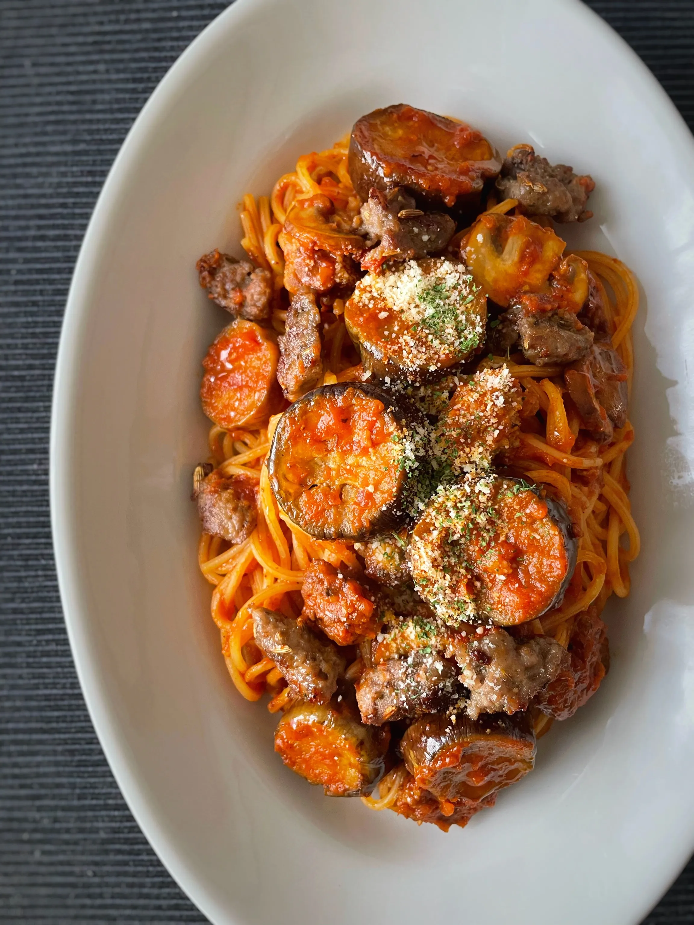 サルシッチャを一口サイズでフライパンで焼いて、出た脂でナスとマッシュルームを炒めて作りました😄