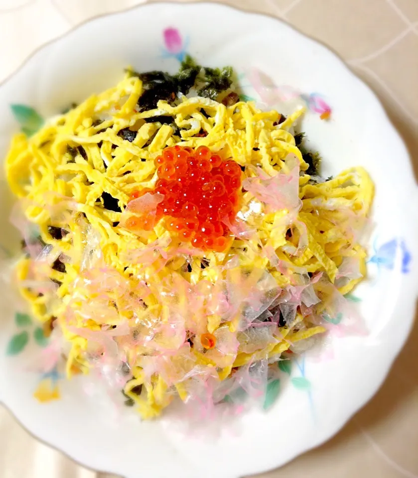 ちらし寿司。ピンクは削りかまぼこ。彩りが良くなります。