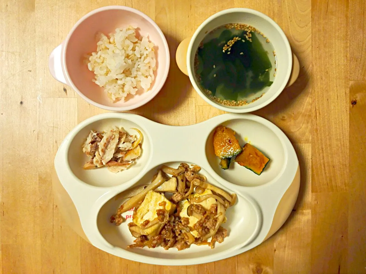 南瓜バター煮、焼き魚(真あじ)、豆腐ステーキそぼろあん、ごはん、わかめスープ(頂き物)