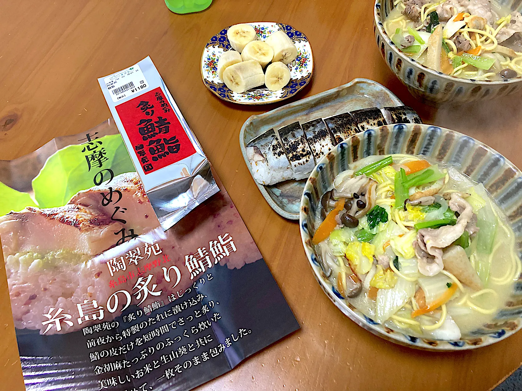 食前バナナ、チャンポン。の陰にチラ見え🫣炙り鯖寿司2度目まして。生わさびが効いて美味しかった!
