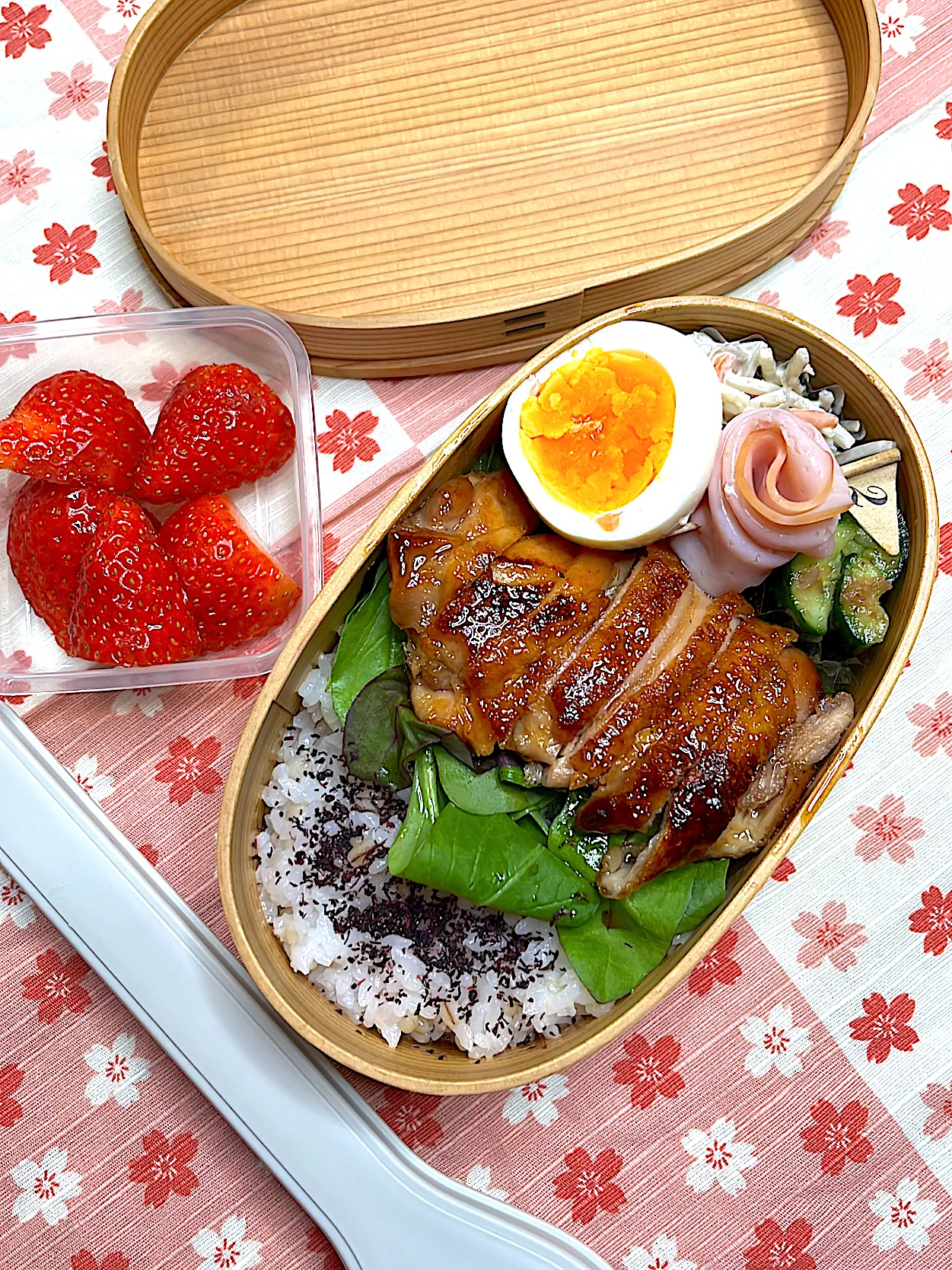 ゆかりご飯、ベビーリーフ、鶏照り焼き、ゆで卵、ゴボウマヨサラダ、きゅうり梅おかか和え、ハム、いちご