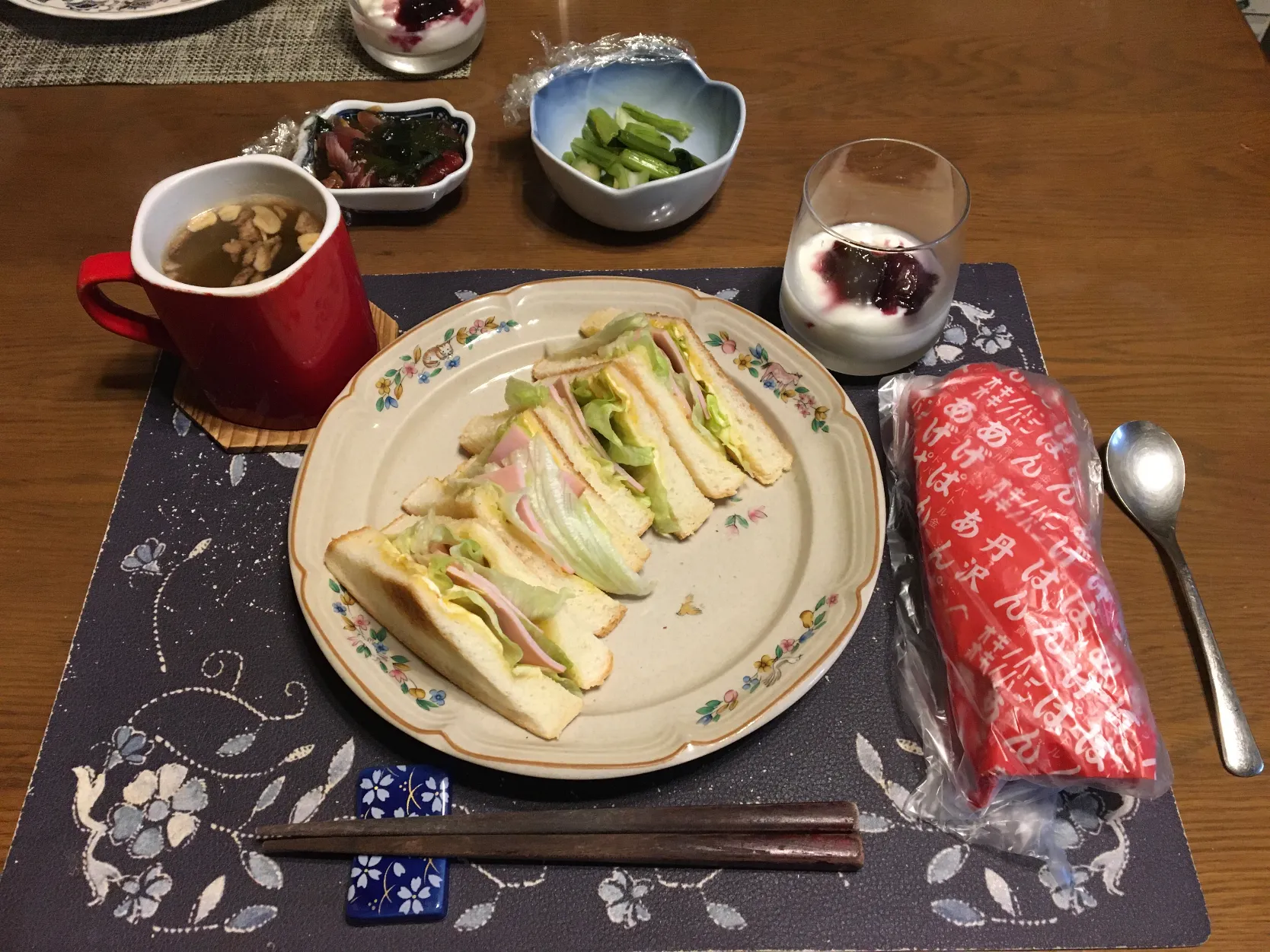 ・トーストサンドイッチ:食パンにマーガリン,マヨネーズ,ねりからしを塗りそれぞれスライスチーズ&シュレッドチーズを乗せて焼きレタス&ロースハム&ひまわり&オリーブオイル&辛味香辛料