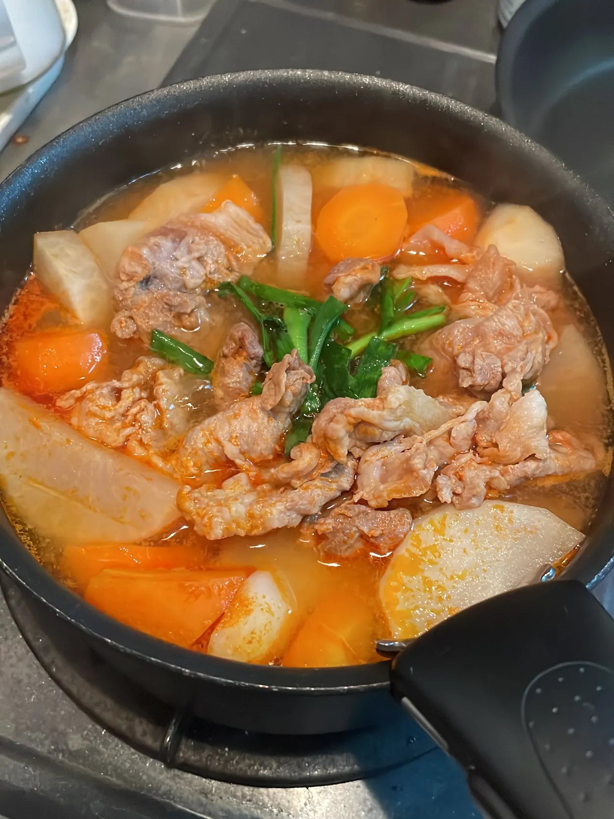 大根、人参、豚肉、ニラ with鍋キューブうま辛キムチ🐎