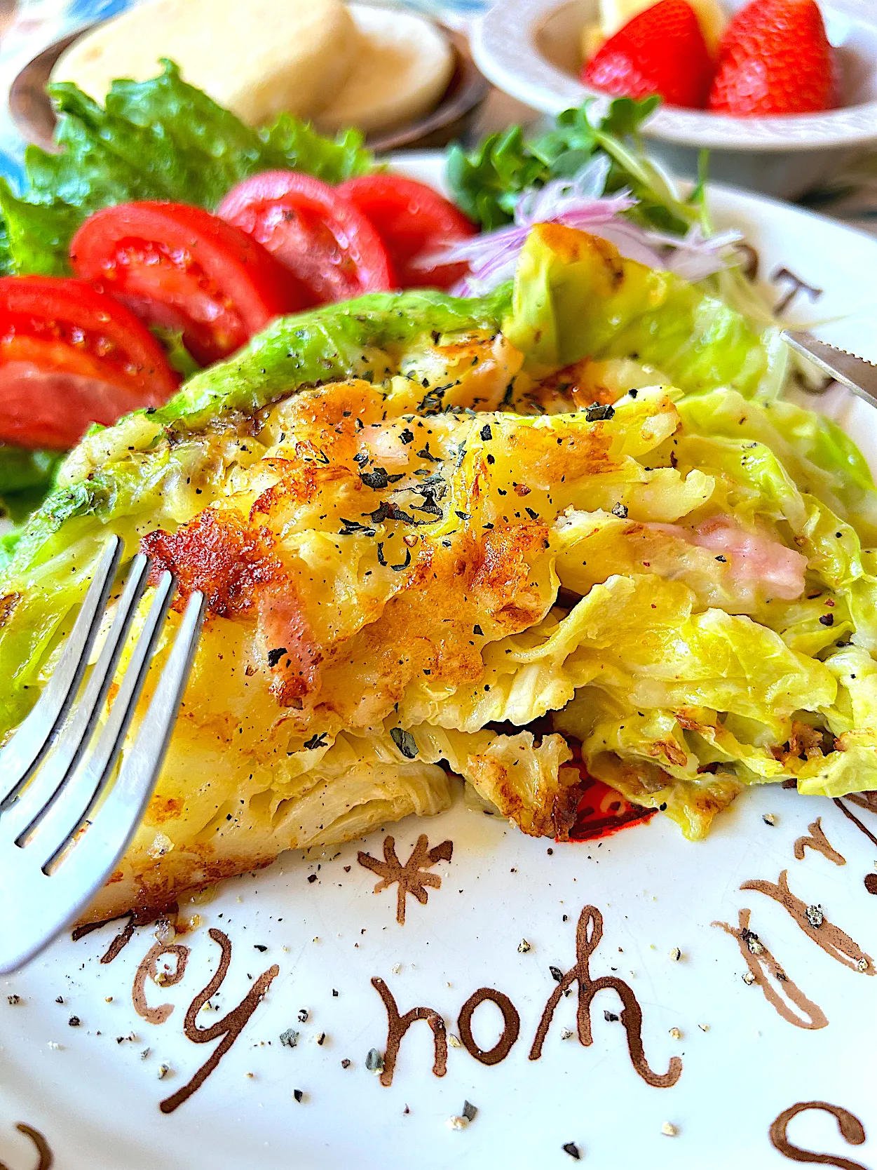 マッシュポテトにチーズ、ベーコンをキャベツの間に重ねて焼いてボリュームを出しちゃいました😊