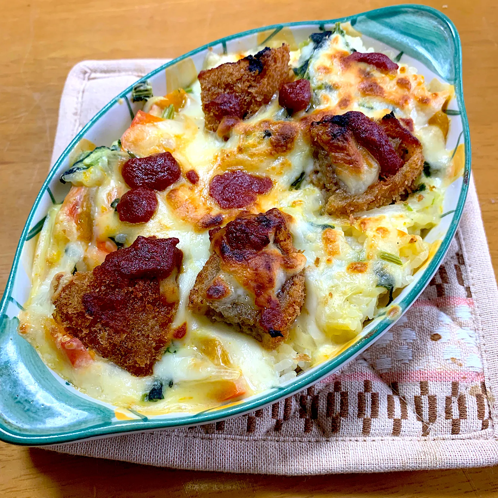 ホワイトソースとひき肉とトマトみそで、ラザニア味のようになりました♪