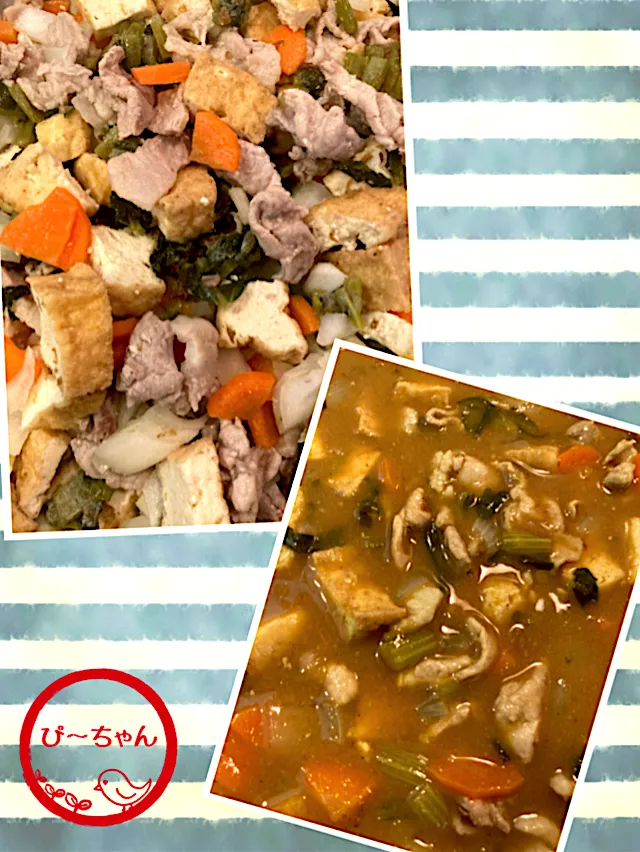 豚肉、厚揚げ、人参、玉ねぎ、小松菜と鰹節を和えて冷凍しといたもの