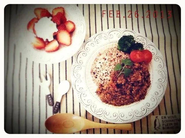 残りもののミートソースをご飯にのせてかんた手抜きランチ。タバスコをたっぷりふりかけるのが👍