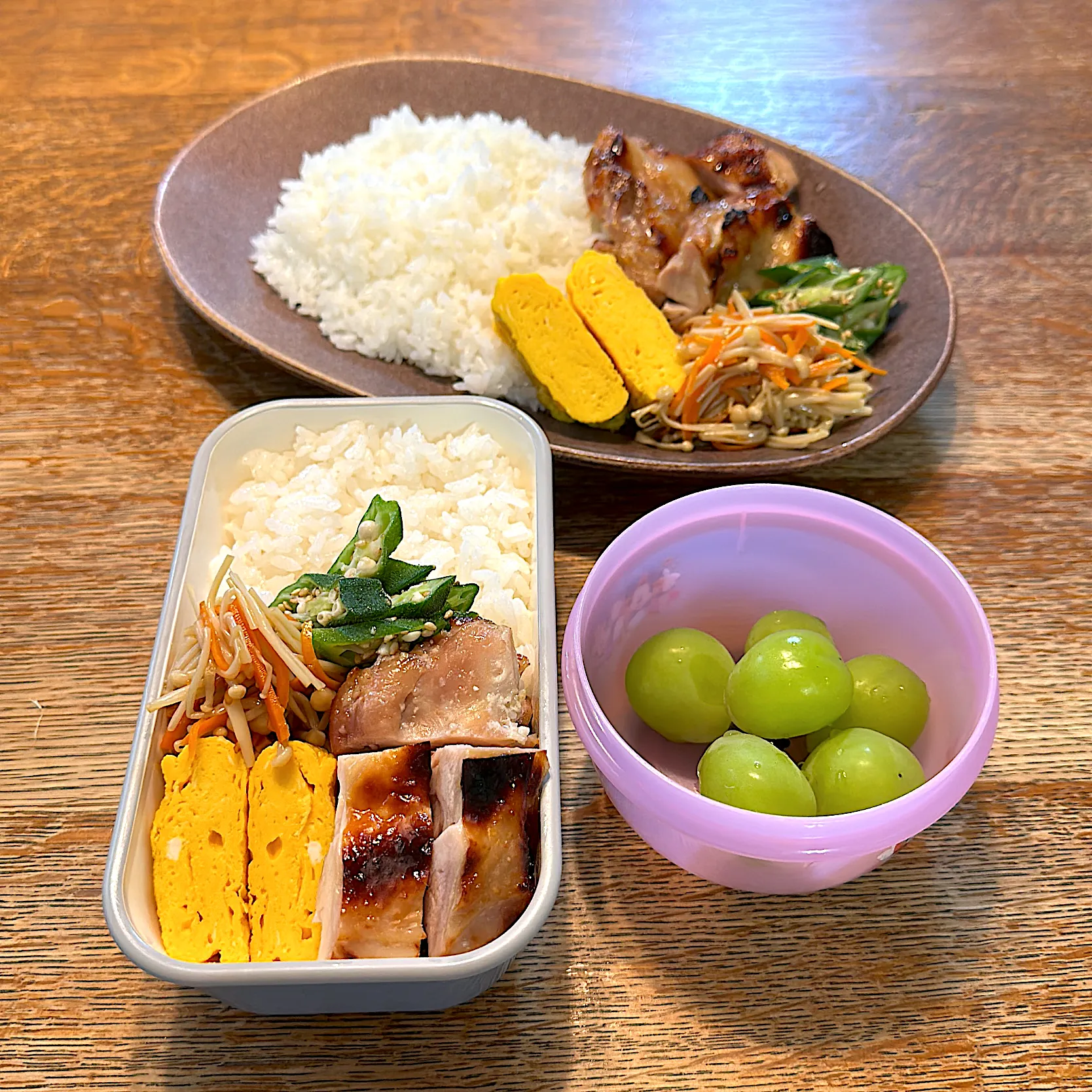 鶏もも肉の塩麹焼き、人参とエノキのきんぴら、オクラのナムル、卵焼き