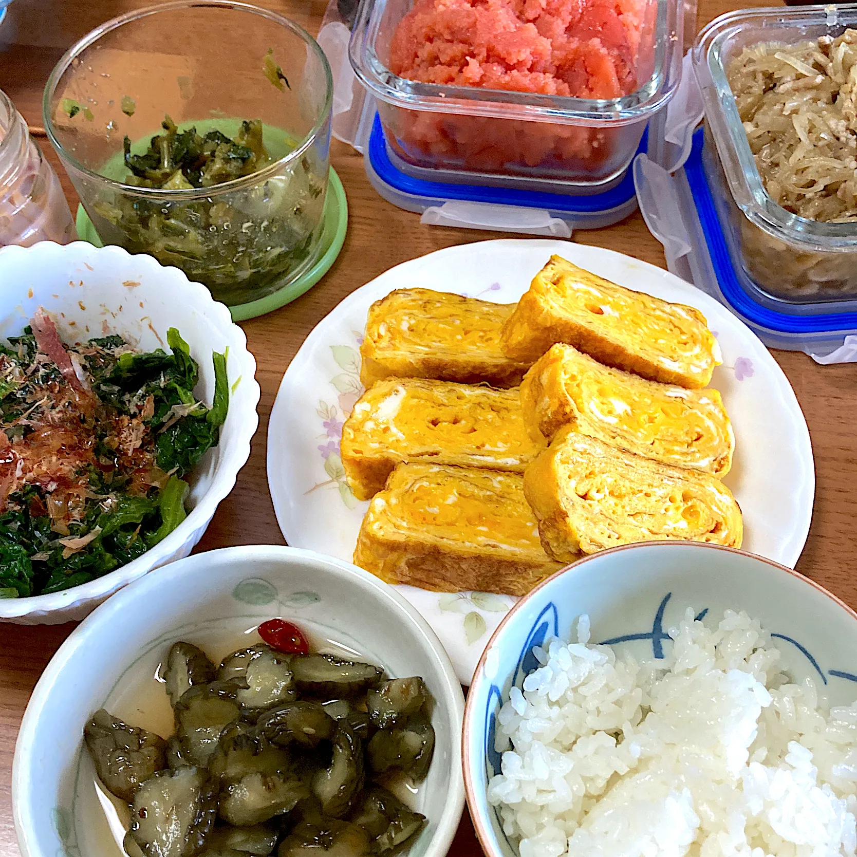 #厚焼きたまご #タラコ #煮物 #ほうれん草 #きゅうり塩漬け #白米