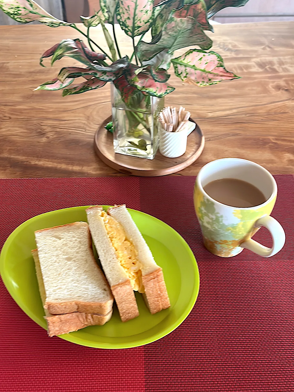 一人なのに、なぜか、早朝から植木の水やり。1時間やってたら、たまごサンドが食べたくなった。6枚切りのパンしかなかったけど、作った。美味しかったー!朝から動く時お腹空くね。笑😆水やりも今日まで、あー疲れた。旦那すごいよ👍