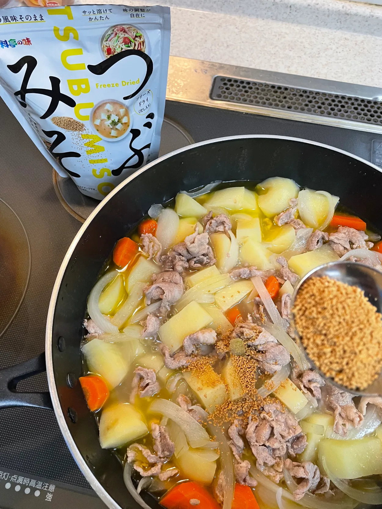 豚肉は夏バテにいいし、じゃがいも、玉ねぎ、にんじんと多くの野菜もとれ、お味噌もからだにいいことから夏の夕食のおかずにぴったりだと思います!