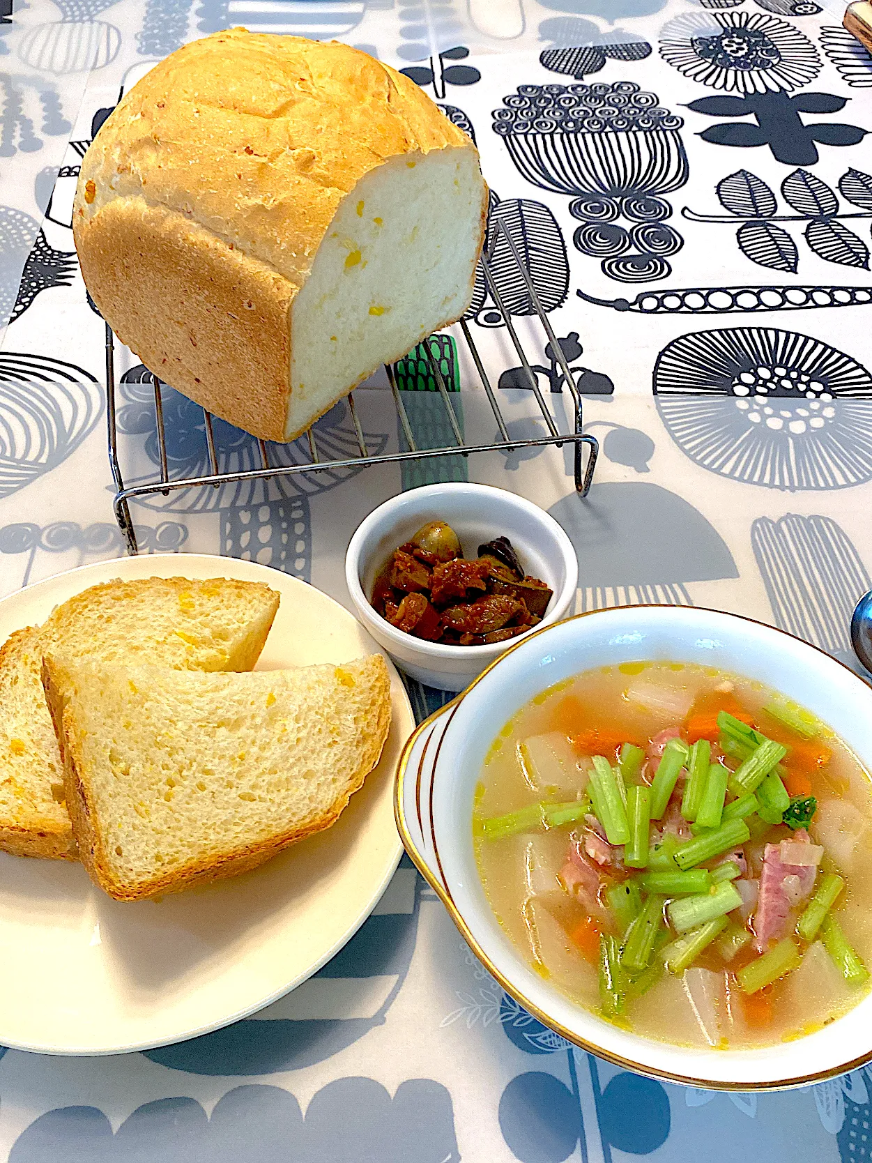 秋が深まり、温かいスープが食べたくて、焼きたてコーンパンに合わせて。秋の名残のラタトゥイユも添えました。 #野菜たっぷり #簡単料理 #低カロリー#暖まります