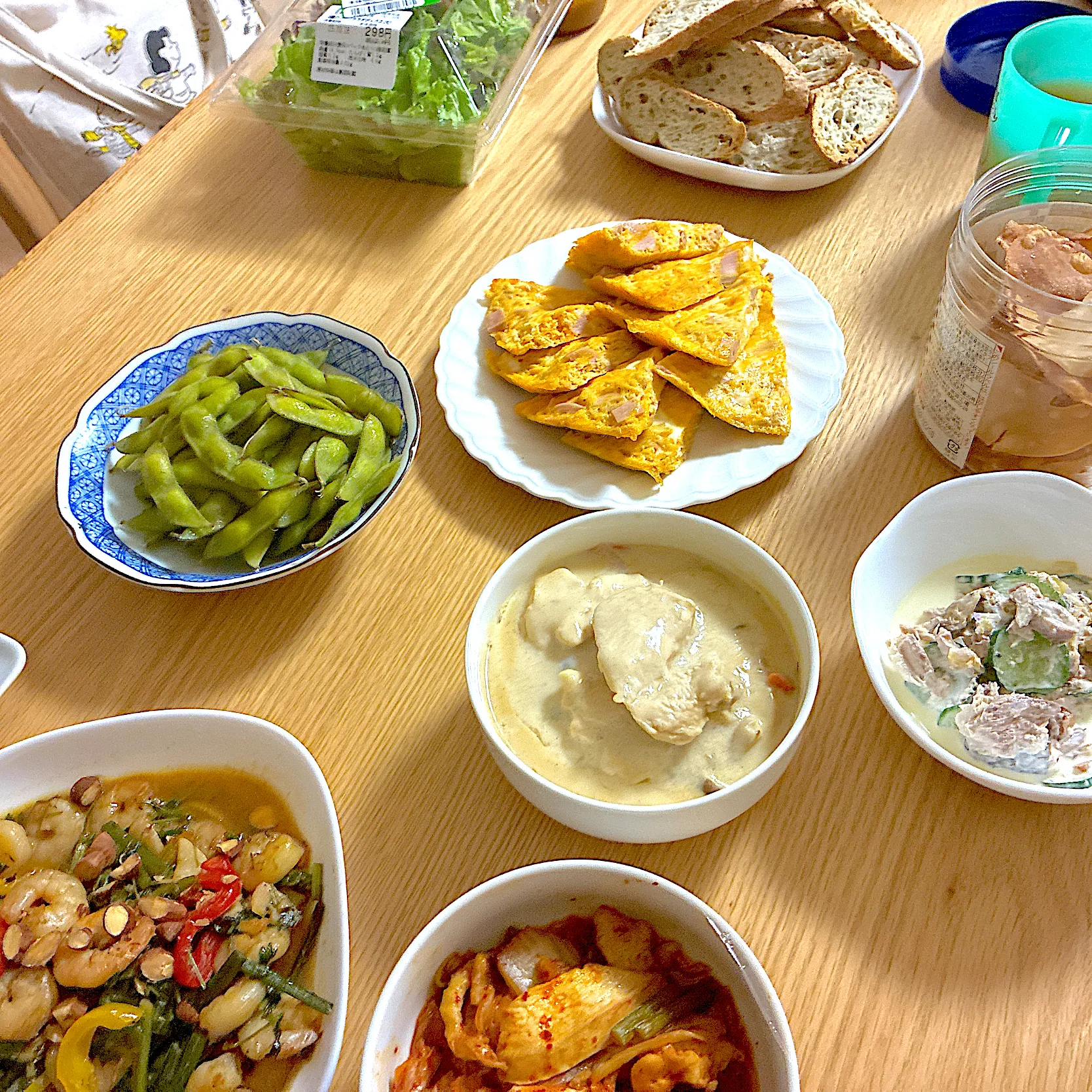チキンのクリーム煮トルコ風、さば缶ときゅうりのマヨネーズ和えVer.3.0、鶏キムチ炒め、海老とパクチーのナンプラー炒め、雑穀バケット、枝豆、ツナとソーセージのオープンオムレツ。
