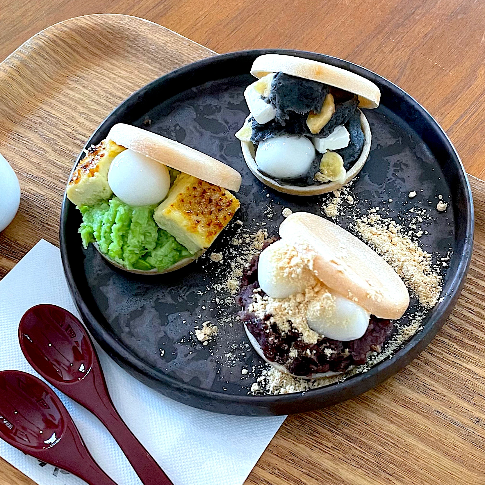 黒ごまあん、クリームチーズ、バナナチップス、白玉の構成。