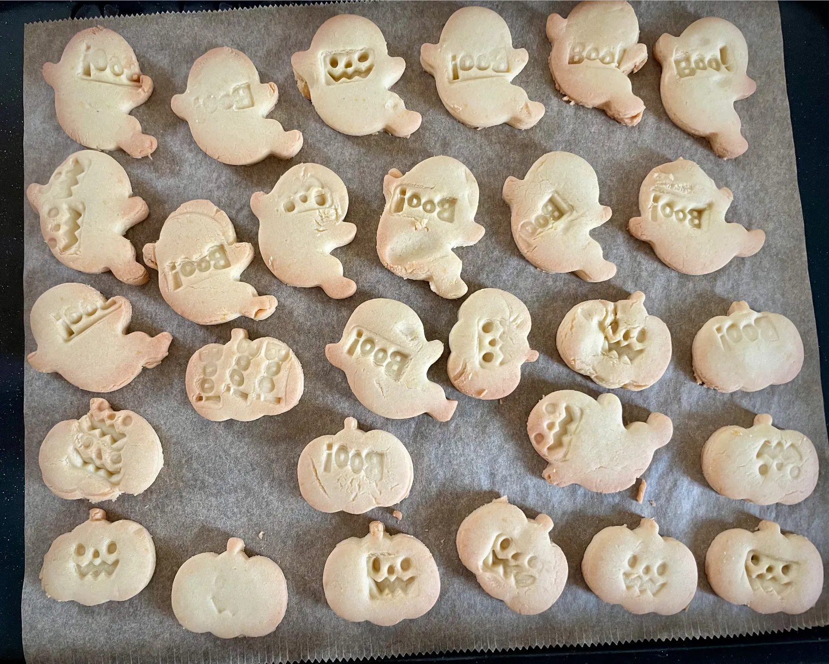 前に作った時は生地を掴んでぐちゃぐちゃにしたりしてたけど、今回はしっかり型抜きやスタンプができて上手に作れました👏