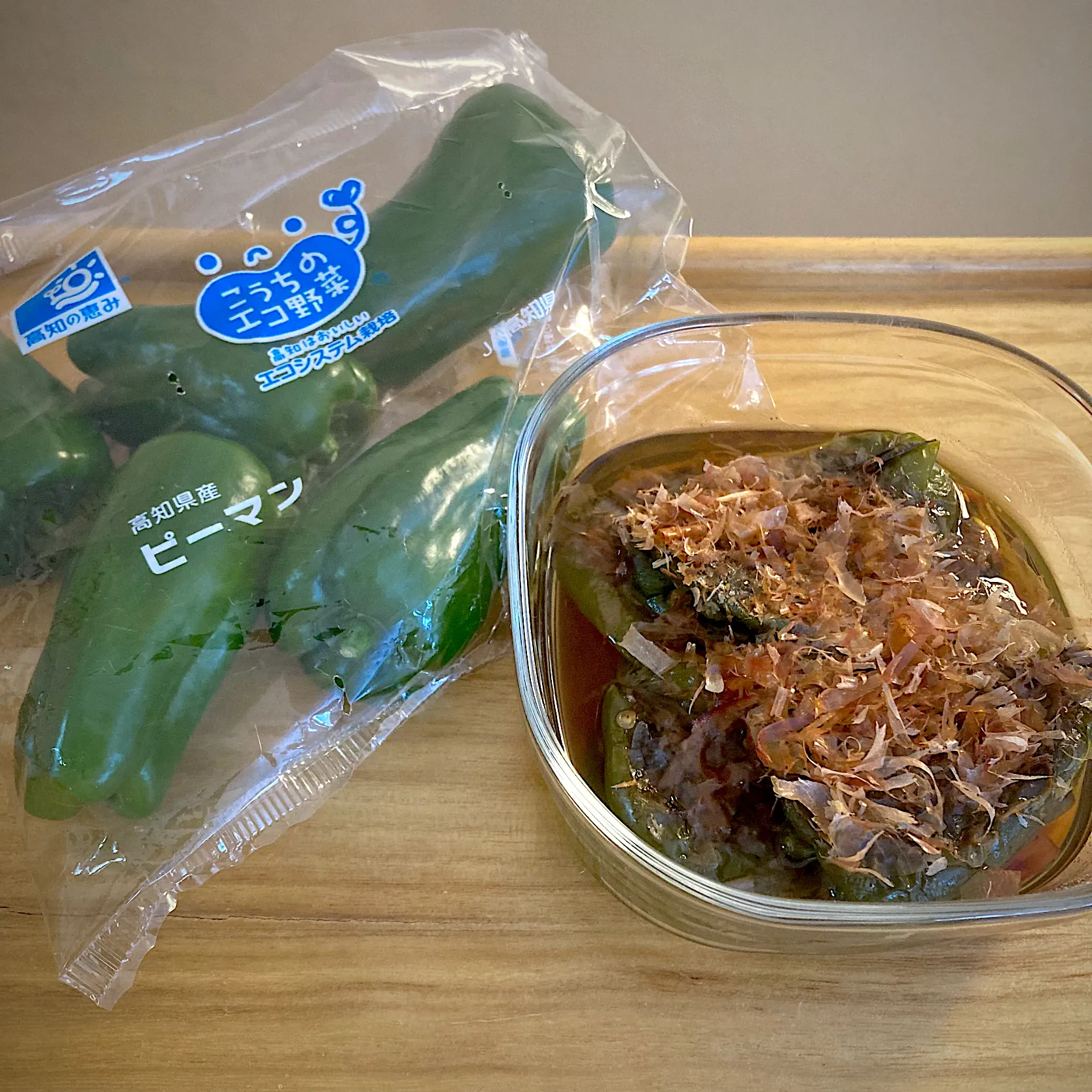 フライ返しで押さえつけて、くたくたのピーマンは、お出汁がしみていいお味…、1人1〜2個では足りません。ごちそうさま😋でした。