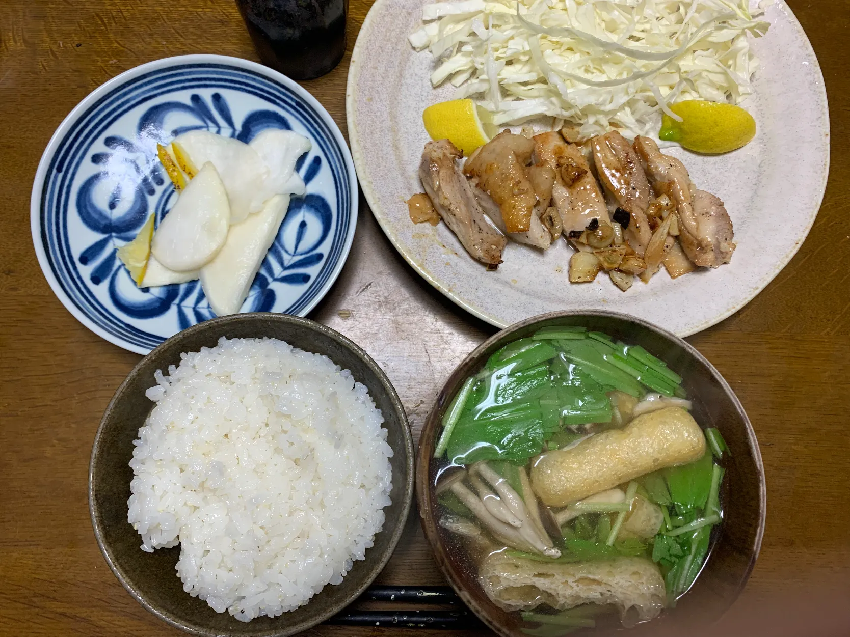 ・具だくさんみそ汁(ブナシメジ、薄揚げ、壬生菜(みぶな)
